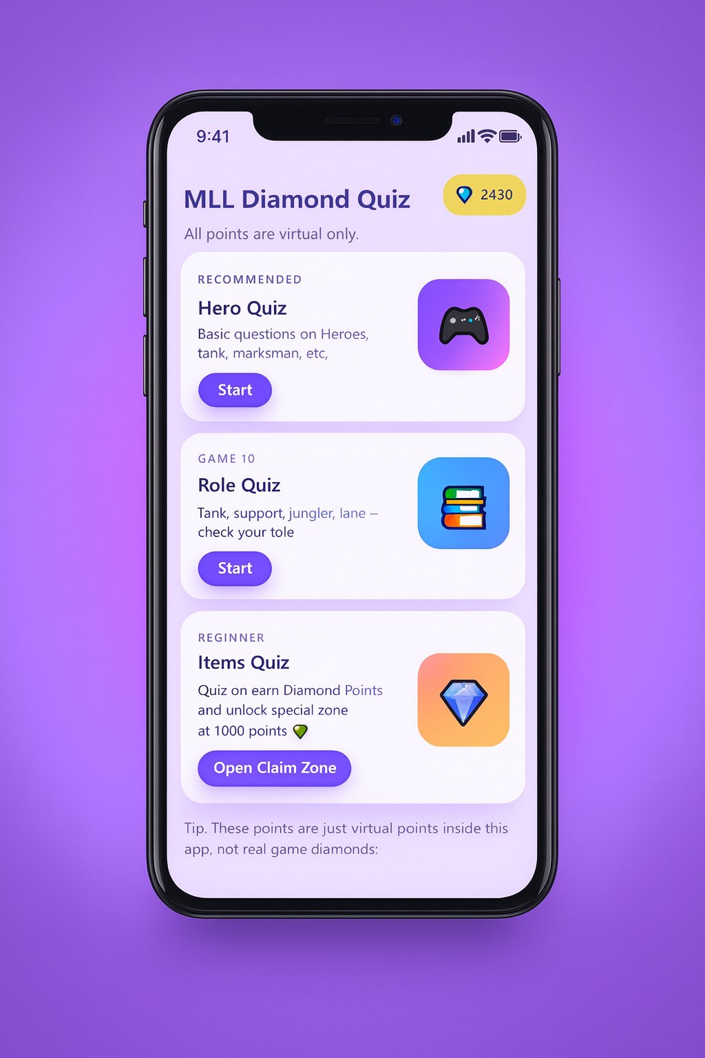 हीरो, आइटम और रोल क्विज़ खेलें और ऐप में डायमंड पॉइंट्स (केवल आभासी) अर्जित करें।