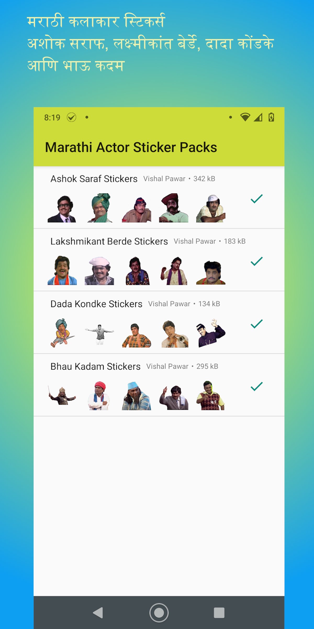 आपले आवदते अशोक सराफ, लक्ष्मीकांत बेर्डे, डेटा कोंडके आणि भाऊ कदम या अॅपचाबरर करून मित्रांना व्हॉट्सअप स्टिकर्स पाठवा।