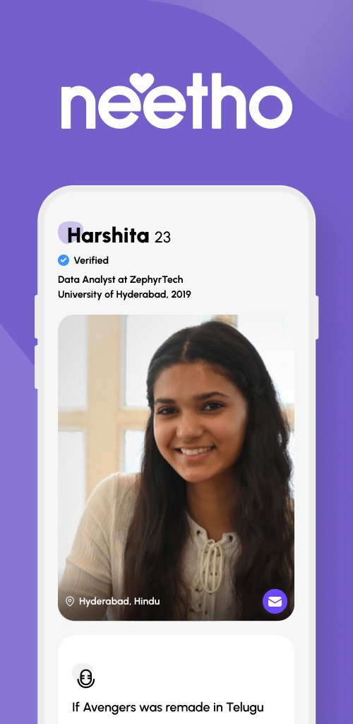 नीथो भारत का पहला स्थानीय भाषा डेटिंग ऐप है जिसे भारत के अंदर और बाहर रहने वाले तेलुगु लोगों को एक सामान्य कारण - लंबे समय तक चलने वाले रिश्ते ढूंढने के लिए करीब लाने के लिए डिज़ाइन किया गया है। तेलुगु में 'नीथो' शब्द का अनुवाद 'आपके साथ' होता है। इसलिए, ऐप को उच्च-इरादे वाले डेटिंग अनुभव प्रदान करने के लिए डिज़ाइन किया गया है जो सांस्कृतिक रूप से तेलुगु आवश्यकताओं के साथ जुड़ा हुआ है। संवेदनशीलता की सराहना करने के लिए नीथो के अनूठे दृष्टिकोण ने इसे सबसे तेजी से बढ़ते स्थानीय भाषा ऐप में से एक बना दिया है; और जैसा कि हम देखते हैं, नीथो जल्द ही तेलुगु समुदाय के लिए वैवाहिक प्लेटफार्मों की आवश्यकता को प्रतिस्थापित करने जा रहा है।