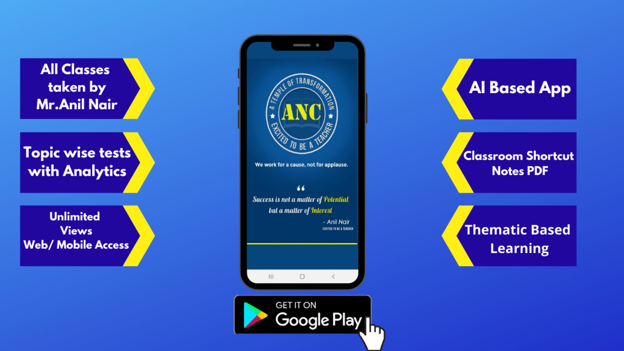 ANC सबसे कुशल और पारदर्शी तरीके से अपने ट्यूशन वर्गों से जुड़े डेटा के प्रबंधन के लिए एक ऑनलाइन मंच है। यह ऑनलाइन उपस्थिति, फीस प्रबंधन, होमवर्क सबमिशन, विस्तृत प्रदर्शन रिपोर्ट और बहुत कुछ के साथ अद्भुत सुविधाओं के साथ एक उपयोगकर्ता के अनुकूल ऐप है- माता-पिता के लिए अपने वार्ड के वर्ग विवरण के बारे में जानने के लिए एक सही समाधान। यह सरल यूजर इंटरफेस डिजाइन और रोमांचक सुविधाओं का एक बड़ा समामेलन है; छात्रों, अभिभावकों और ट्यूटर्स द्वारा बहुत प्यार किया।