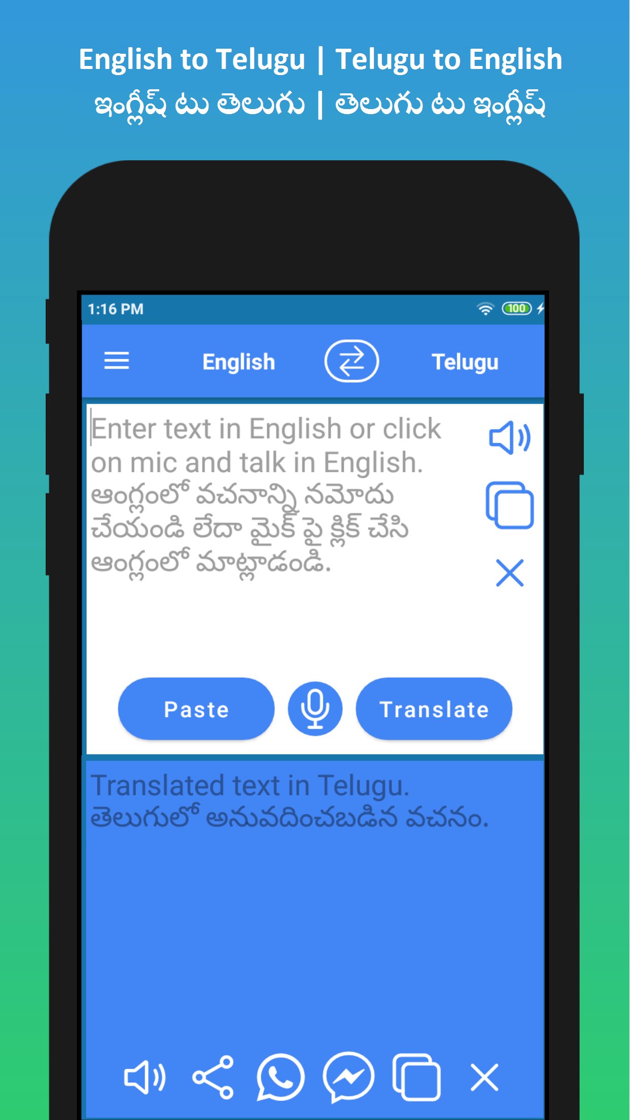 ✓ हमारे निःशुल्क अंग्रेजी से तेलुगु अनुवादक ऐप का उपयोग करके आसानी से अंग्रेजी पाठ का तेलुगु में अनुवाद करें। आप तेलुगु से अंग्रेजी अनुवाद भी कर सकते हैं।