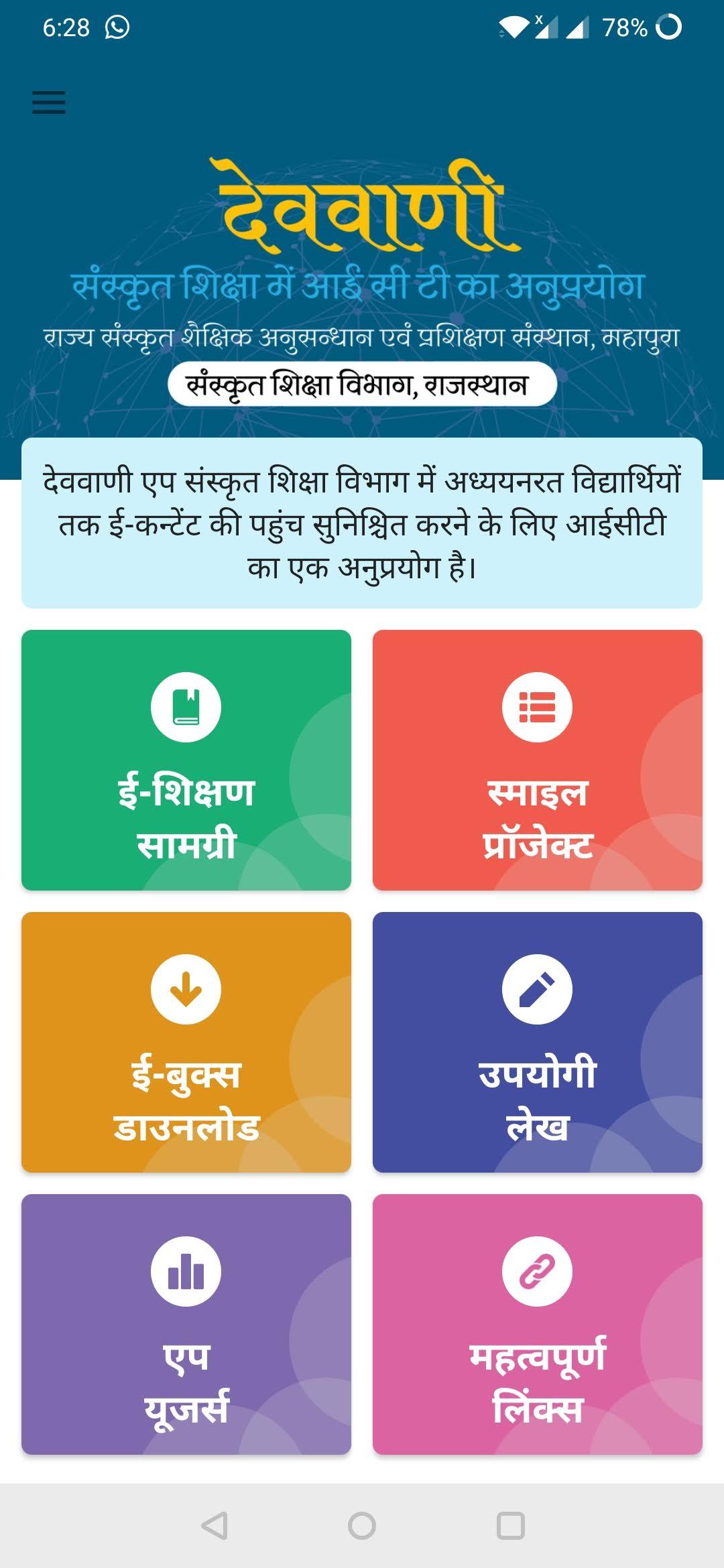 देववाणी ऐप SSECRT, जयपुर द्वारा प्रबंधित और इमरान खान, शिक्षक और अप्पगुरु द्वारा निर्मित संस्कृत शिक्षा विभाग की एक समर्पित ऐप है। This app विभिन्न प्रारूपों जैसे कि शैक्षिक वीडियो, पीडीएफ, ऑनलाइन टेस्ट आदि में जाने पर कक्षावार शैक्षिक सामग्री प्रदान करता है।