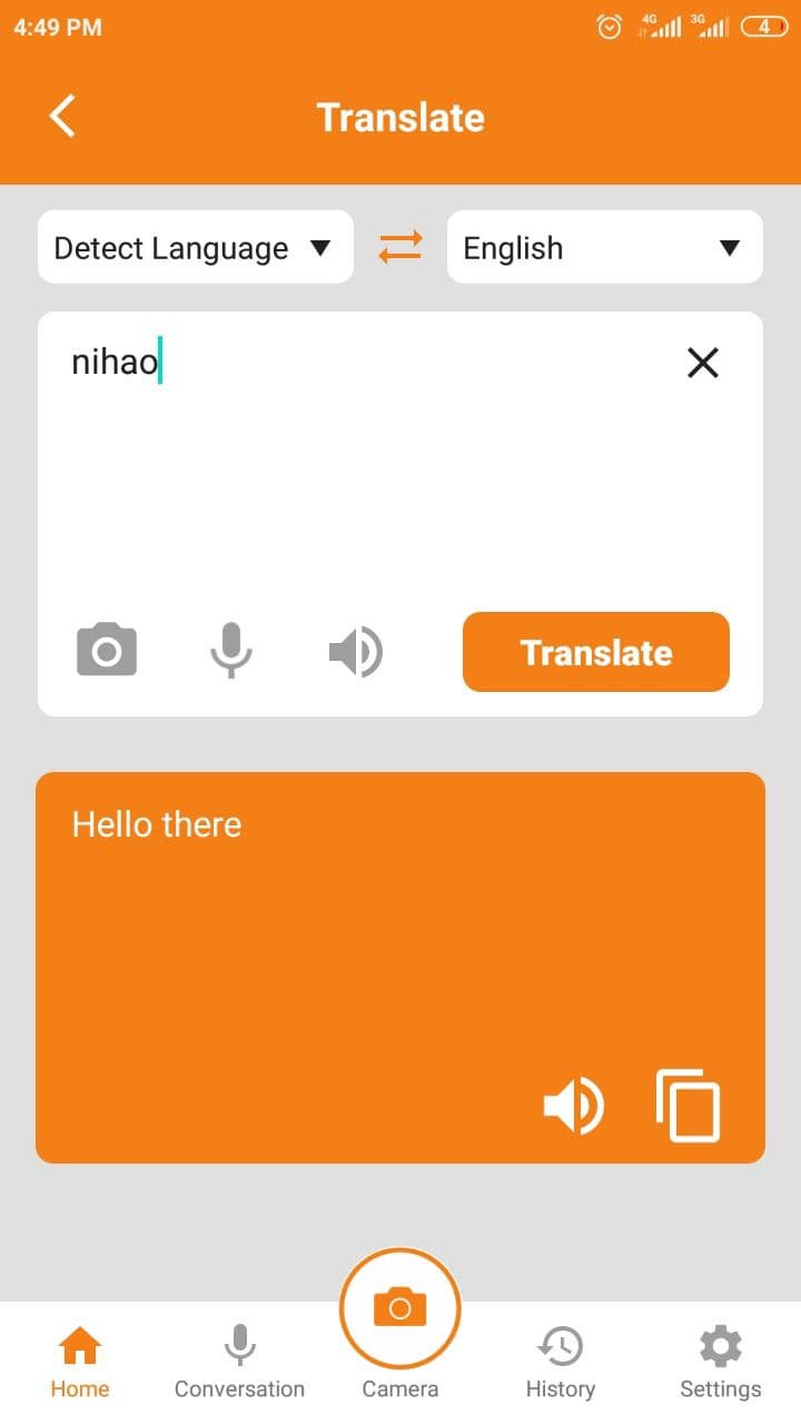 - कैमरा ट्रांसलेशन: आप ट्रांसलेशन करने के लिए पिक्चर लेने के लिए हमारे कैमरे का इस्तेमाल कर सकते हैं, जब आप किसी किताब के पेज को ट्रांसलेट करना चाहते हैं, तो सूचना बोर्ड, ट्रैफिक साइन, यूजर गाइड का अनुवाद करना चाहते हैं।