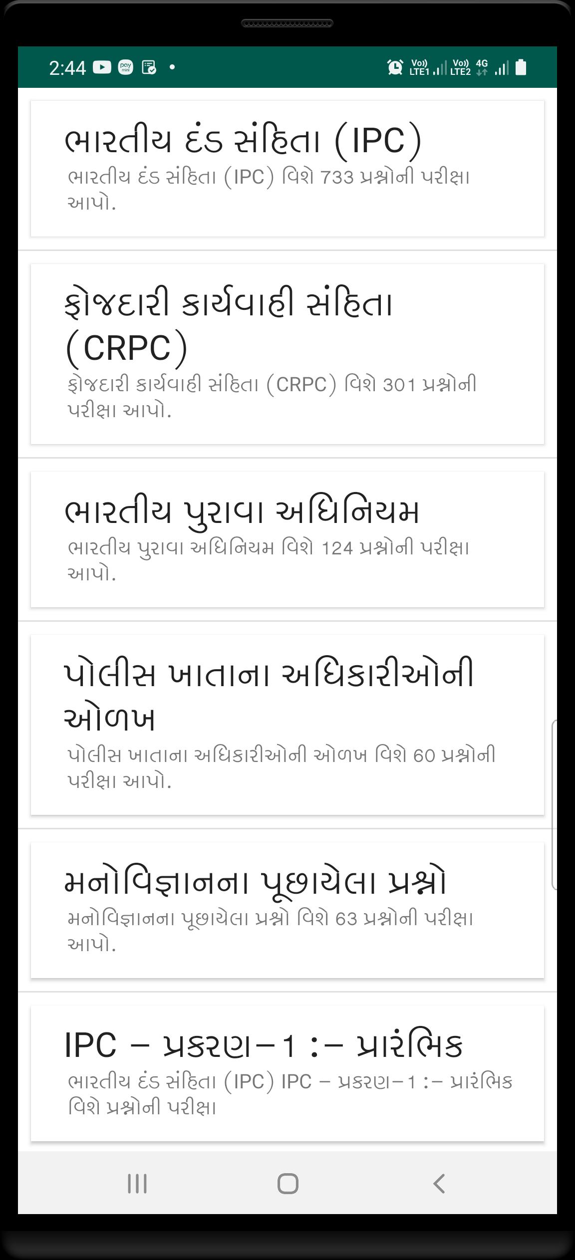 Gujarat Police Exam preparation app includes topics like General Knowledge, Current Affairs, Computer Knowledge, Psychology, History, Geography, Social Studies, General Mental Ability, General Science, Constitution of India (Primary level), etc.