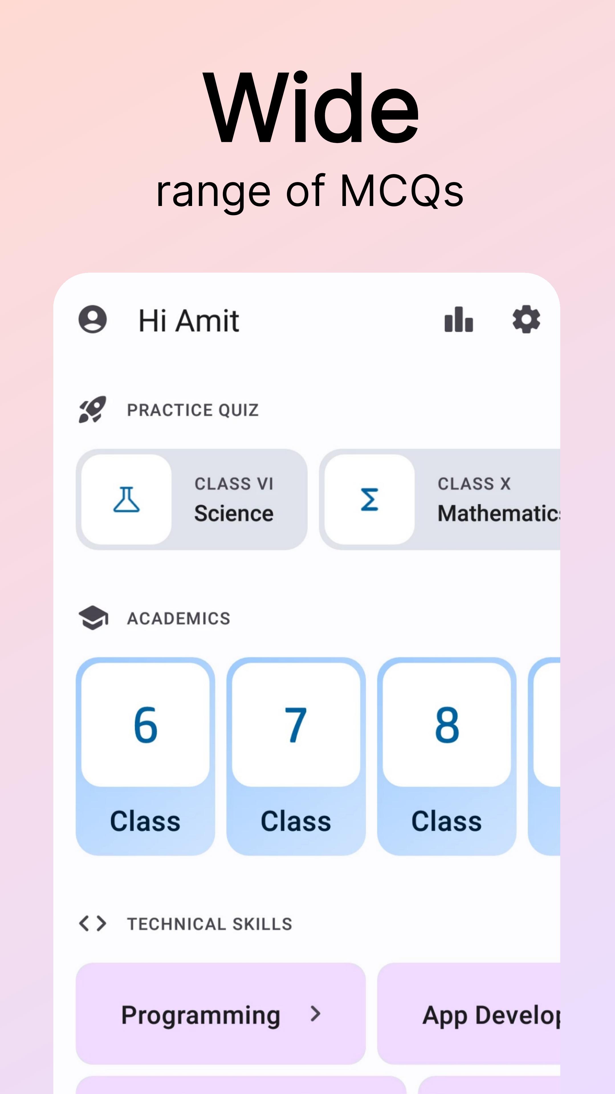 शिक्षाविदों के तहत, कक्षा 6 से 10 तक के छात्र गणित, विज्ञान, सामाजिक विज्ञान और अन्य विषयों में एमसीक्यू का अभ्यास करके अपनी शिक्षा को सुदृढ़ कर सकते हैं।