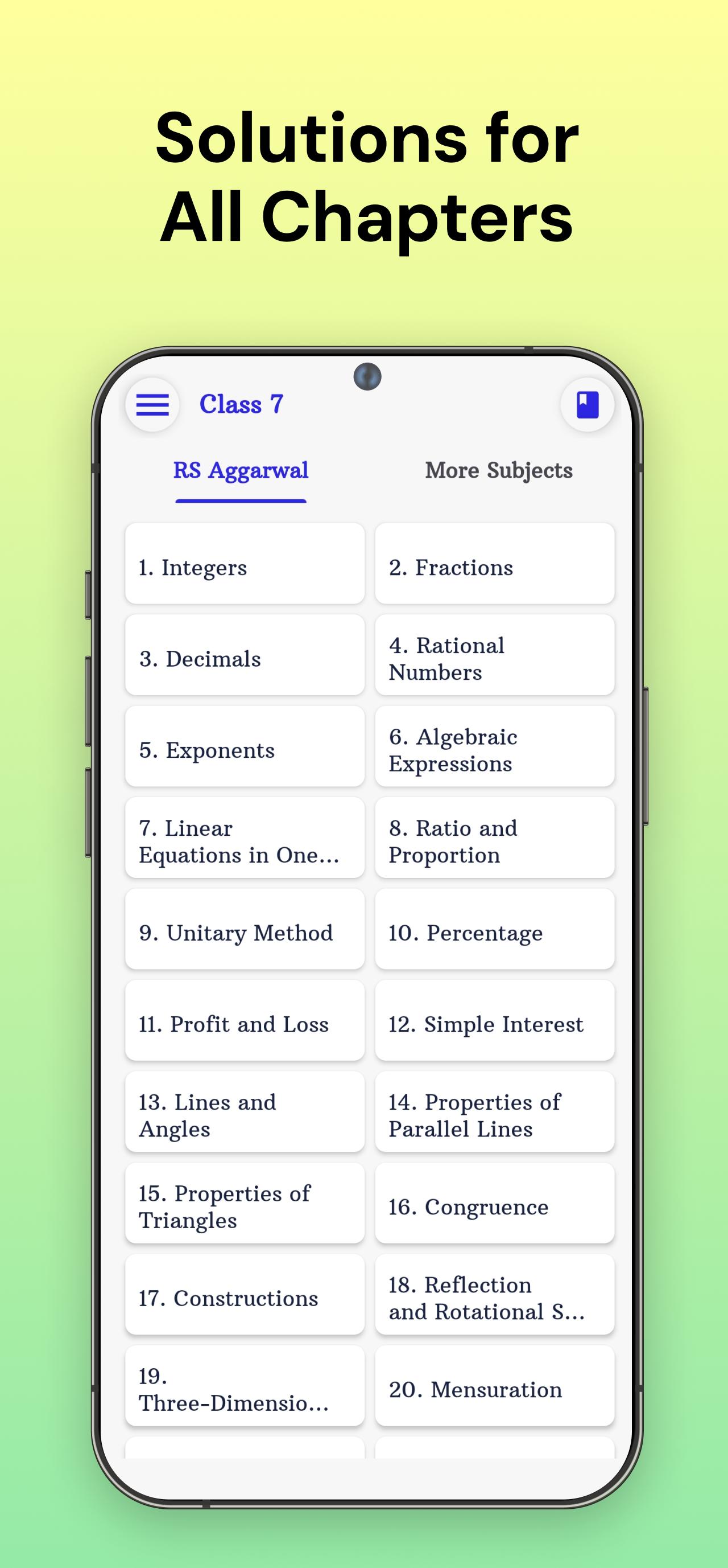 इस ऐप में आपको आरएस अग्रवाल की कक्षा 7 की गणित की किताब के सभी सवालों के समाधान मिलेंगे।