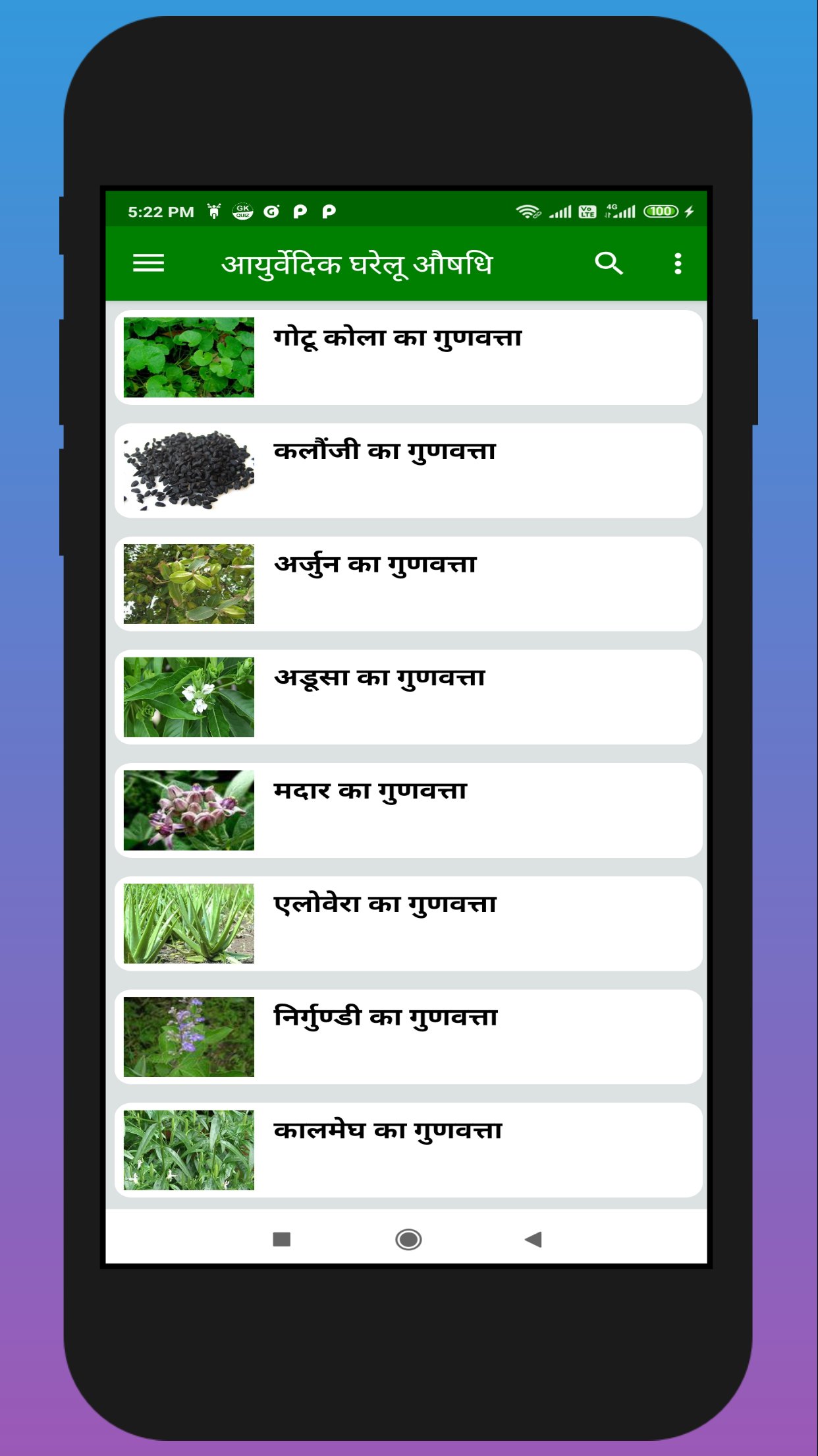 हमें यह जानना होगा कि विभिन्न प्रकार के औषधीय पौधे हैं जिन्हें हम दवा के रूप में खा सकते हैं। आज इस ऐप में हमने औषधीय पौधों की चर्चा की है जो आपको विभिन्न घातक बीमारियों से छुटकारा दिलाएंगे और पेड़ की जादुई शक्ति आपको ठीक करेगी। औषधीय पौधों के गुणों, औषधीय पौधों के विभिन्न लाभों के बारे में हैं, किसी भी औषधीय पौधे के गुण और विशेषताएं क्या हैं। औषधीय पौधों के कई लाभ हैं जो हम में से कई लोग नहीं जानते होंगे। औषधीय पौधों के हमारे लिए कई लाभ हैं। विभिन्न रोगों के इलाज के लिए औषधीय पौधों के गुण अमूल्य हैं।