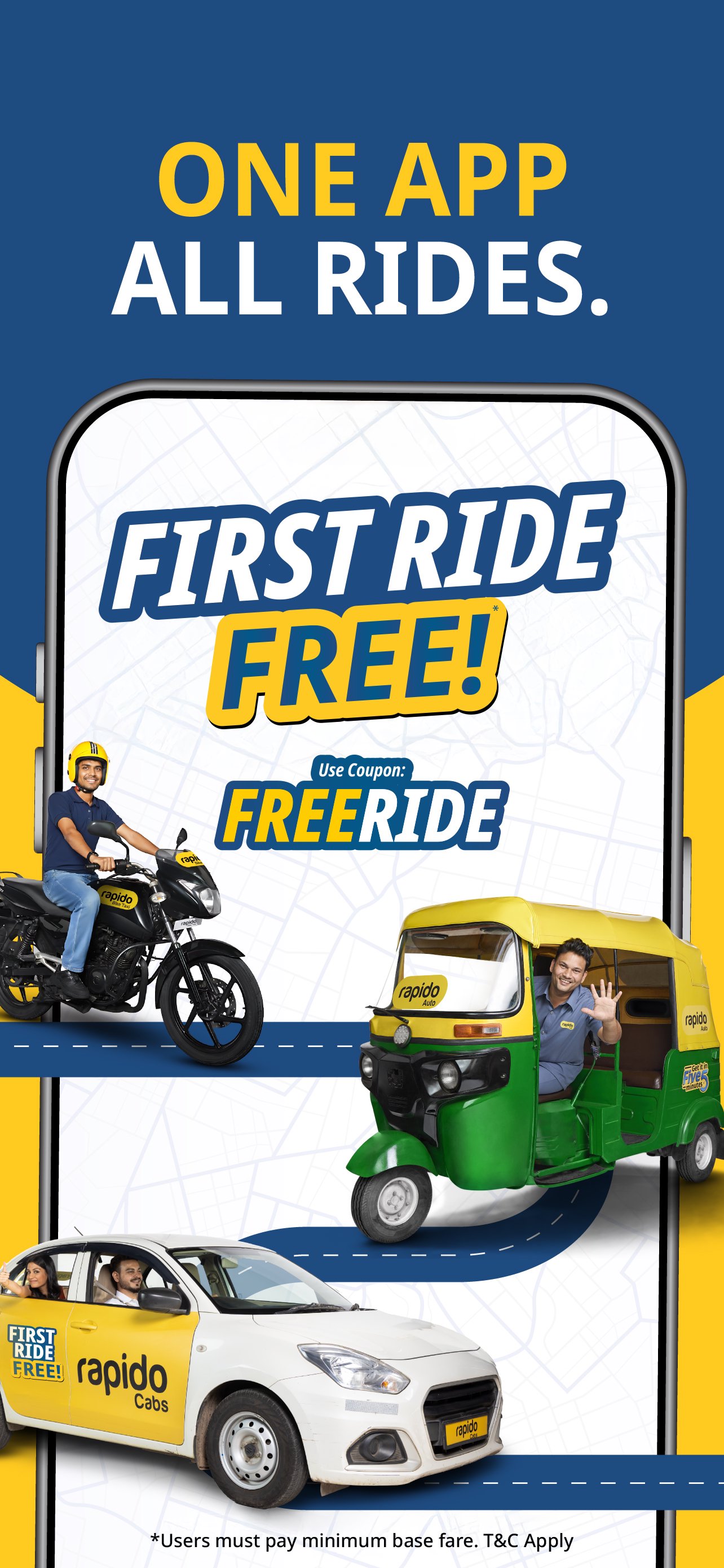 रैपिडो ऐप डाउनलोड करें और अपनी पहली बाइक-टैक्सी या ऑटो राइड पर 50% की छूट पाएं।