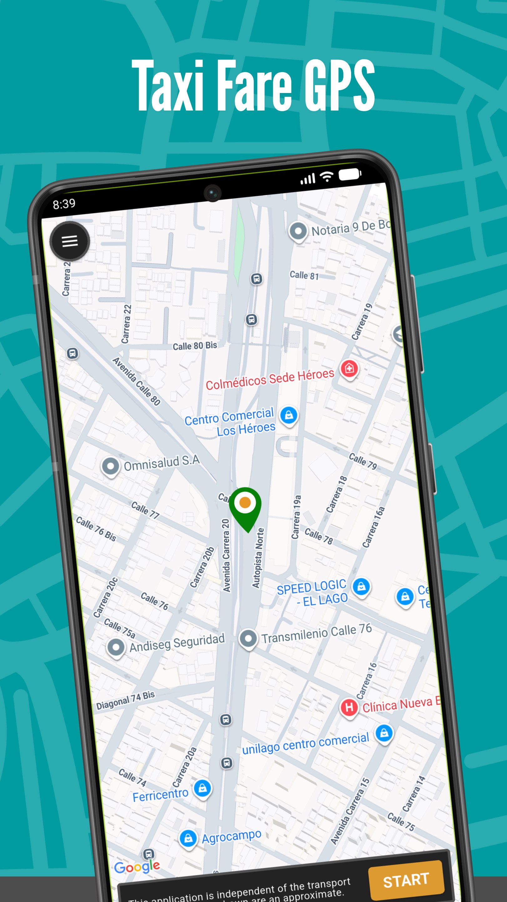 हमारा जीपीएस टैक्सीमीटर आपको अपने सेल फोन का उपयोग करके टैक्सी प्रकार के वाहन में यात्रा की लागत का अनुमान लगाने की अनुमति देता है। प्रारंभ में, कोलंबिया, अर्जेंटीना, चिली, इक्वाडोर, मैक्सिको और संयुक्त राज्य अमेरिका के कुछ शहर पूर्व-कॉन्फ़िगर किए गए थे, लेकिन आप अपना खुद का शहर बना सकते हैं।