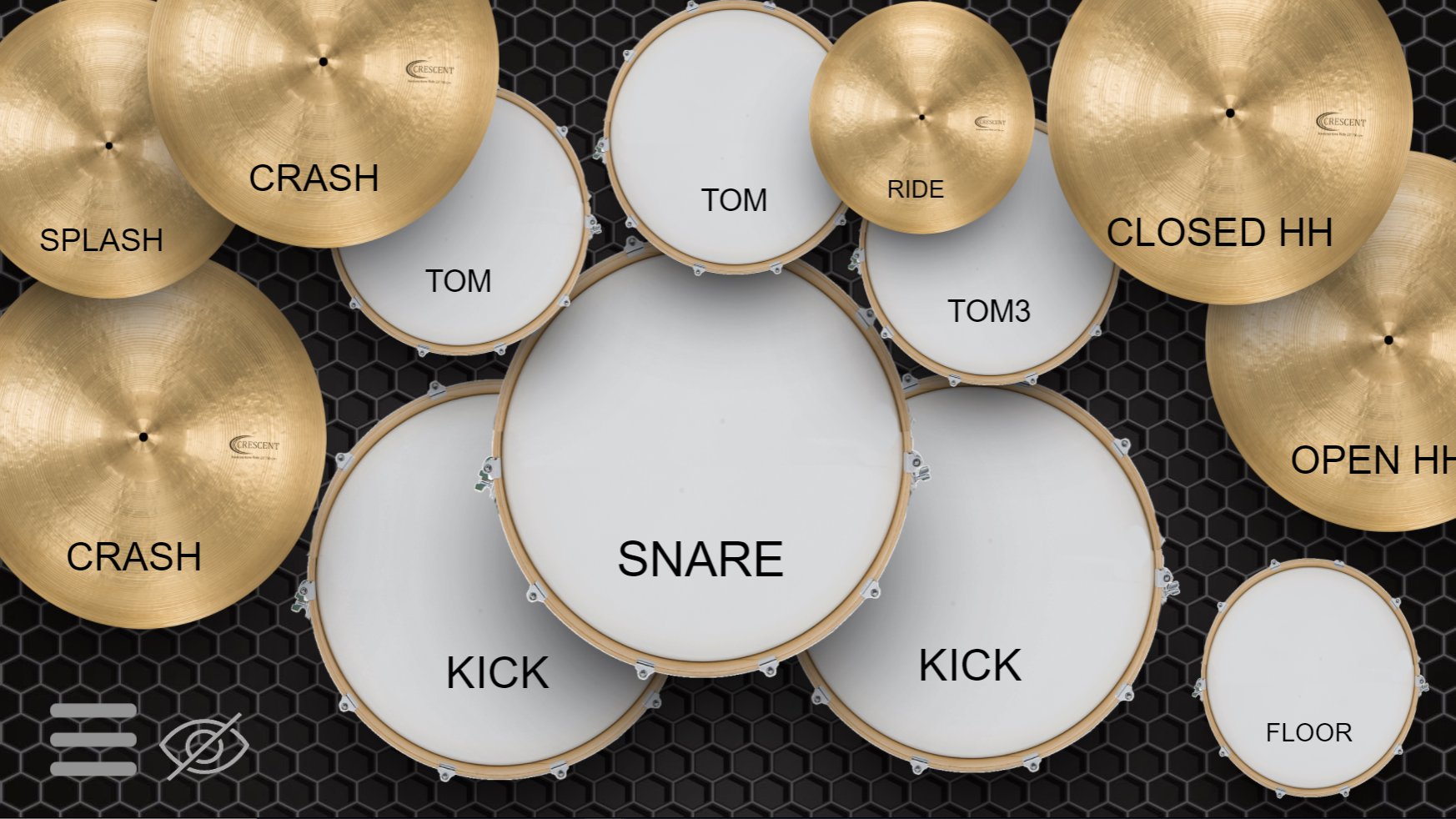 स्नेयर ड्रम, बेस ड्रम, टॉम, सिंबल, हाय-हैट, और असली असली ड्रम की तरह फ्लोर टॉम खेलें!
