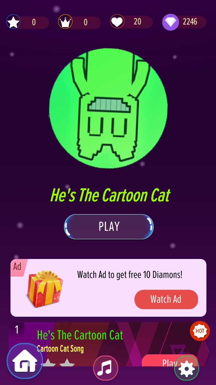 टाइल्स पर टैप करके ताल और गाने की टाइलों का पालन करने की कोशिश करें, टाइलें छूटी नहीं हैं, और सभी समय के सर्वश्रेष्ठ साउंडट्रैक कार्टून कैट गानों का आनंद लें।