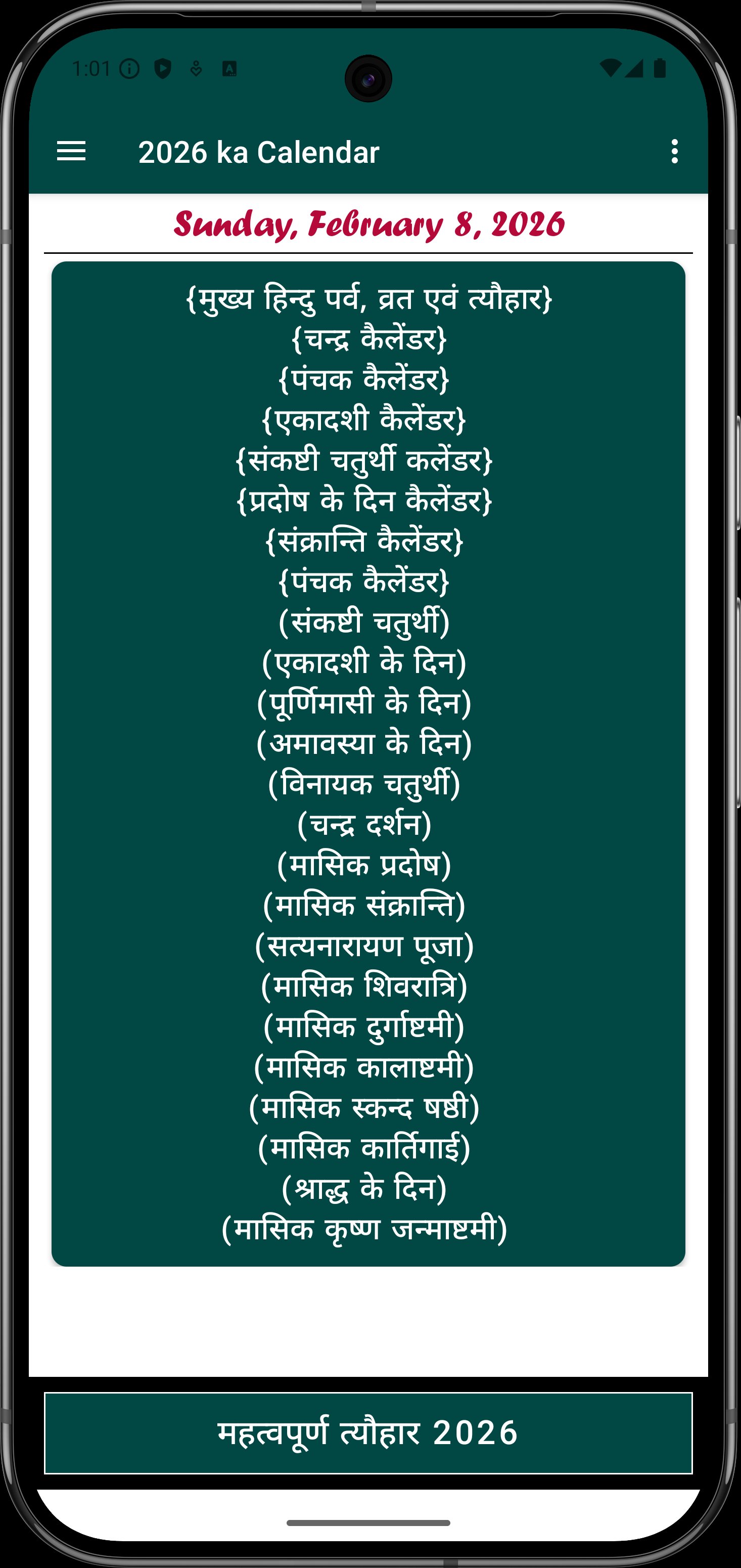 2026 Hindu Calendar & Vrat एक सरल और उपयोगी ऐप है जिसमें वर्ष 2026 के