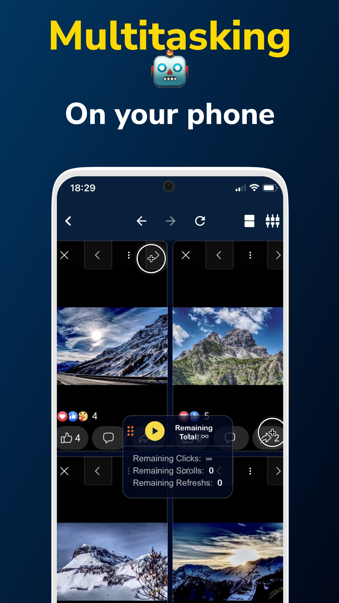 हमारा एप्लिकेशन आपकी मदद कर सकता है, आप इसे कहीं भी और किसी भी तीव्रता के साथ टैप, स्वाइप, रीफ्रेश या यहां तक कि सामग्री के माध्यम से स्क्रॉल करने के लिए शेड्यूल कर सकते हैं।