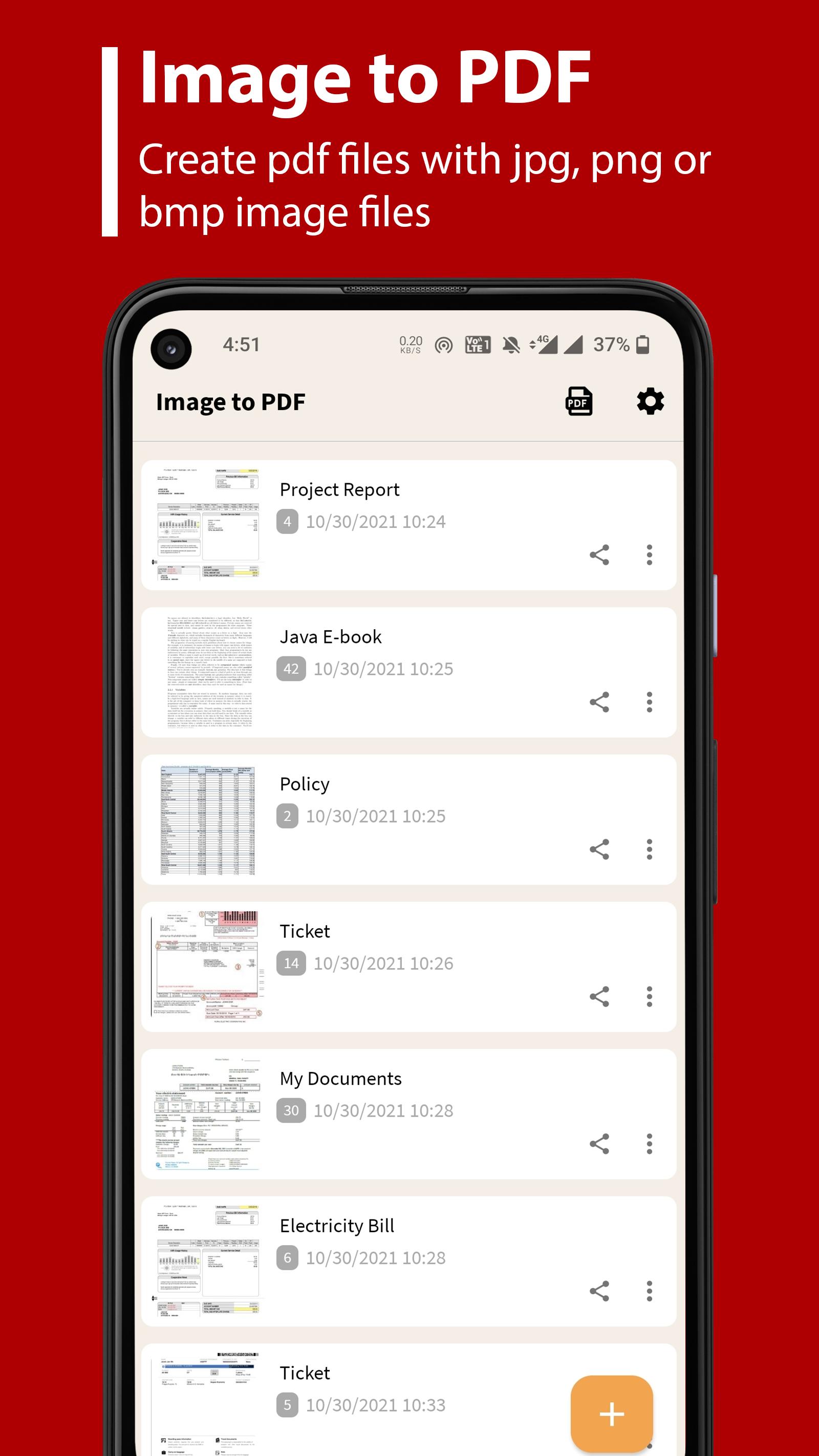 पीडीएफ मेकर एप्लिकेशन में छवि जिसमें आप आसानी से छवियों को आयात कर सकते हैं या अपने कैमरे के साथ पेपर फाइलों को स्कैन कर सकते हैं और एक साधारण टैप में पीडीएफ प्रारूप में कनवर्ट कर सकते हैं और साथ ही आप रसीद, चालान, नोट्स, दस्तावेज, फोटो, बिजनेस कार्ड, प्रमाण पत्र, व्हाइटबोर्ड स्कैन कर सकते हैं। आदि।