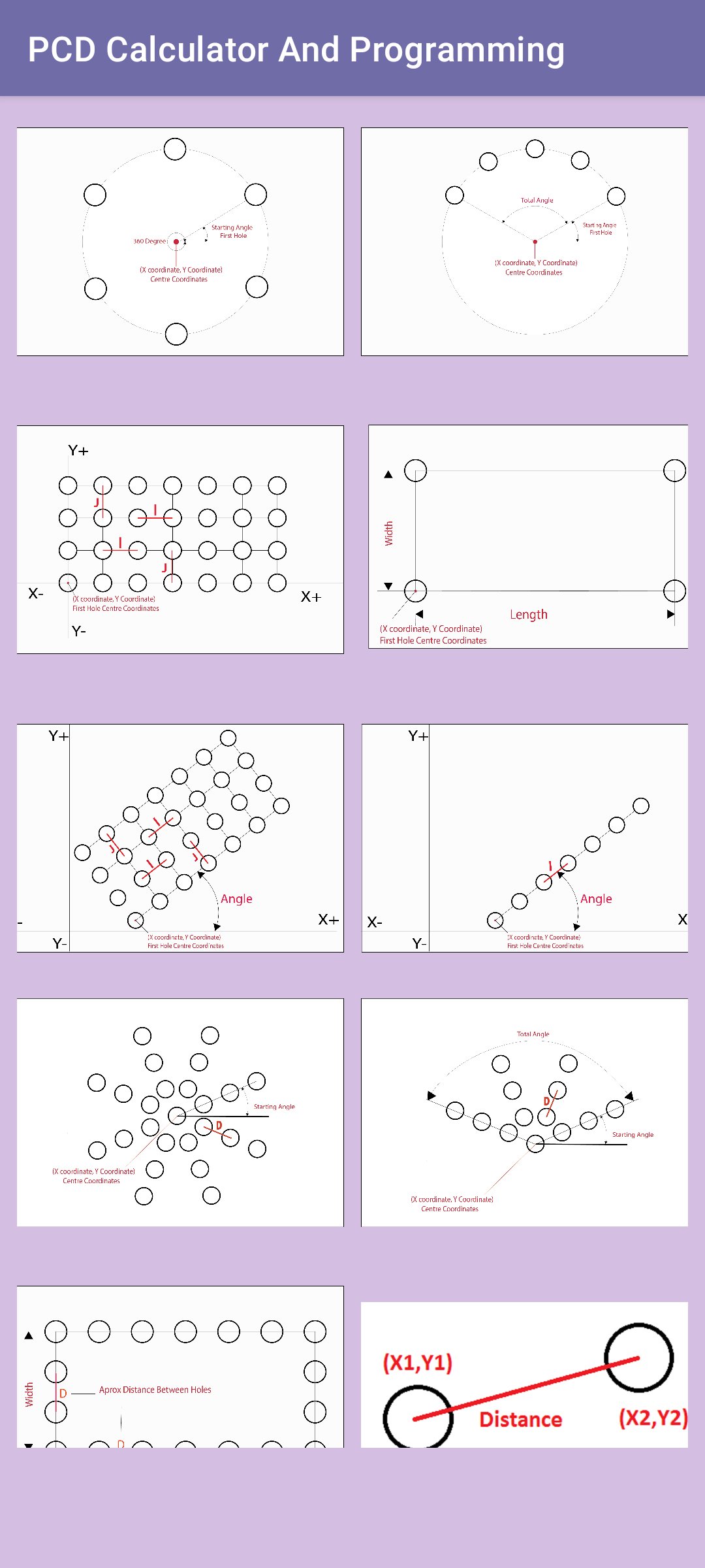 PCD कैलकुलेटर और प्रोग्रामिंग एप्लिकेशन एक तरह का एप्लिकेशन है जो नए CNC/VMC प्रोग्रामर्स को पिच सर्कल डायमीटर/PCD होल के निर्देशांक जानने में मदद करता है।