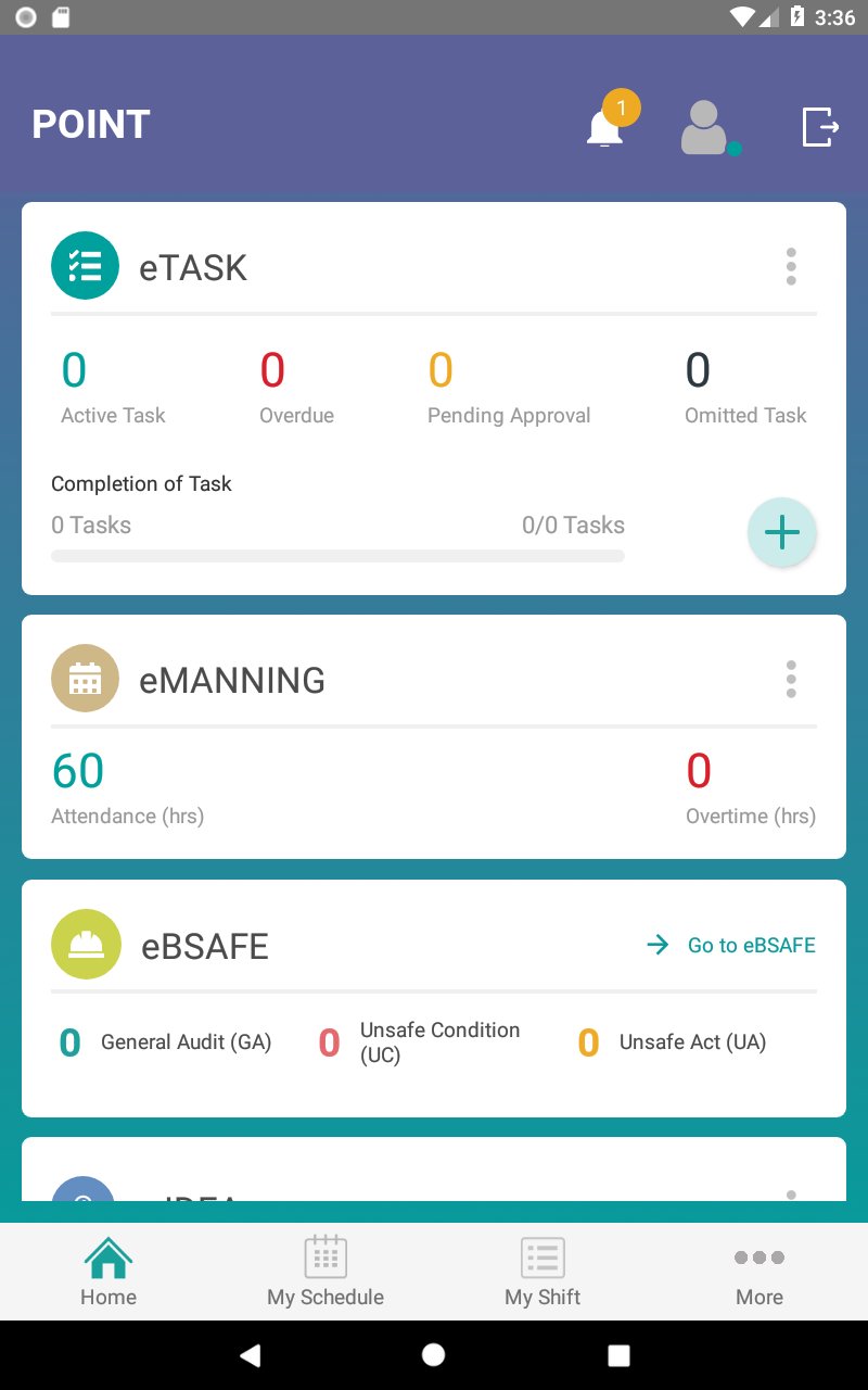 POINT को वेब और मोबाइल प्लेटफ़ॉर्म दोनों में एक्सेस किया जा सकता है जिसमें छह मॉड्यूल (eMANNING, eTASK, eGTASK, eLOG, eBSAFE और eIDEA) शामिल हैं:
