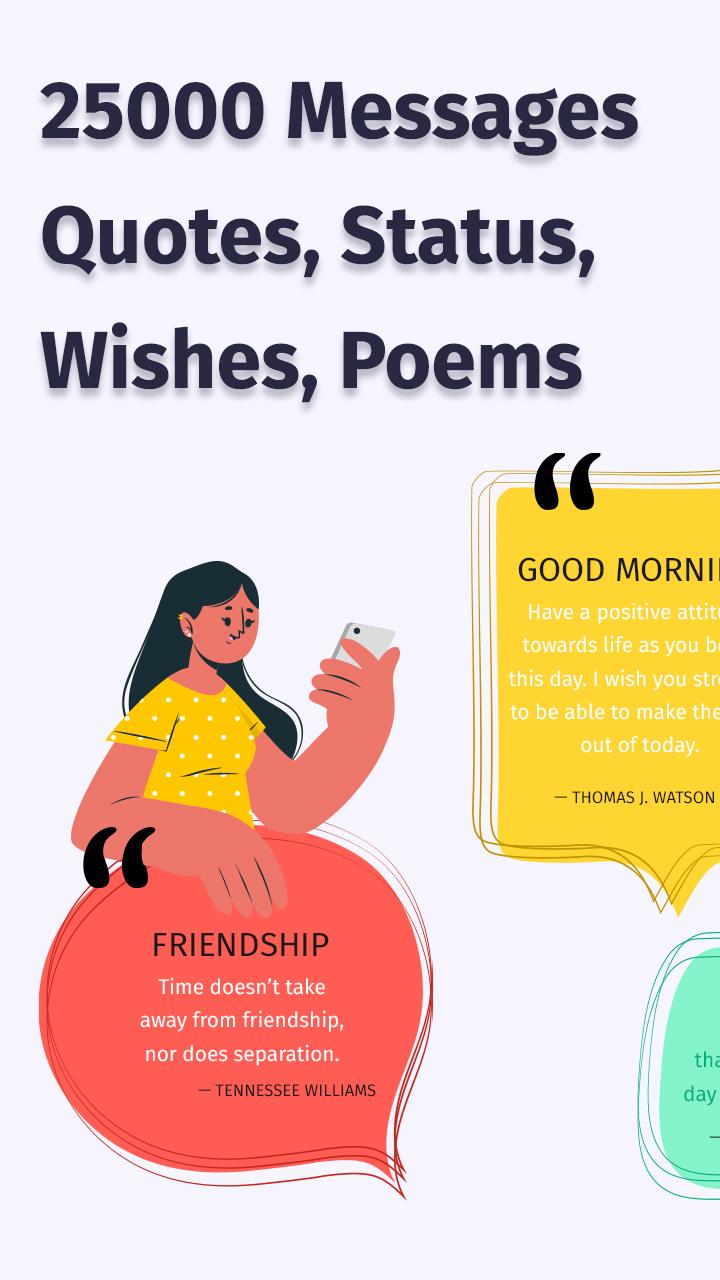 25000 संदेशों, उद्धरणों, स्थिति, शुभकामनाओं, कविताओं के साथ प्यार, खुशी और प्रेरणा साझा करें – आपकी सभी मैसेजिंग ज़रूरतों के लिए सबसे अच्छा ऐप। चाहे वह दिल को छू लेने वाली जन्मदिन की शुभकामना हो या कोई दिल को छू लेने वाला दोस्ती का उद्धरण, इसे यहाँ पाएँ और किसी का दिन रोशन करें!