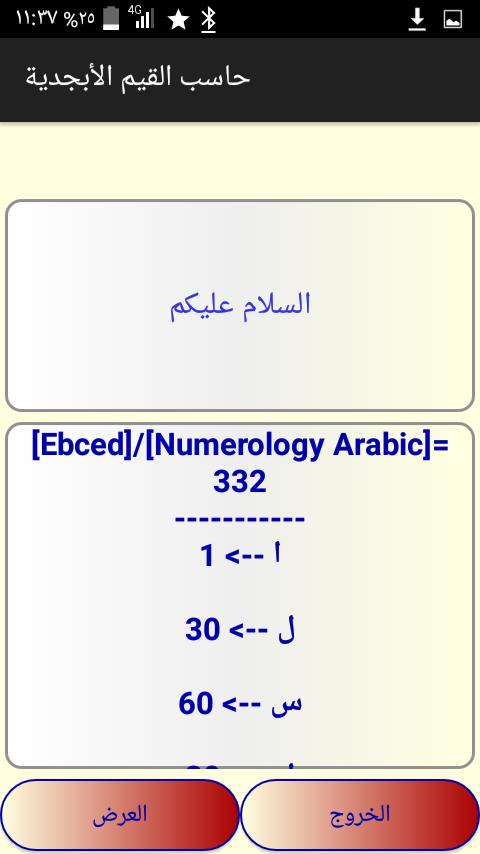 Enter an arabic short word in arabic letters and display its numerology value. Have fun!