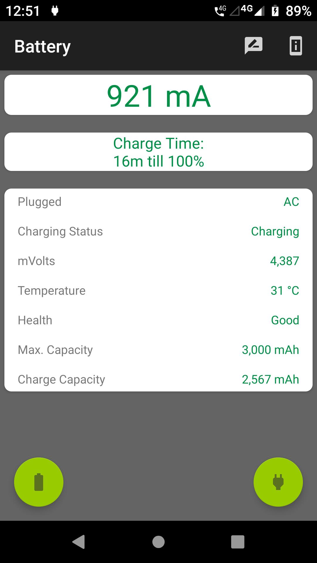 बैटरी ऐप वास्तविक समय में बैटरी को चालू छोड़ने और दर्ज करने का प्रदर्शन करता है।