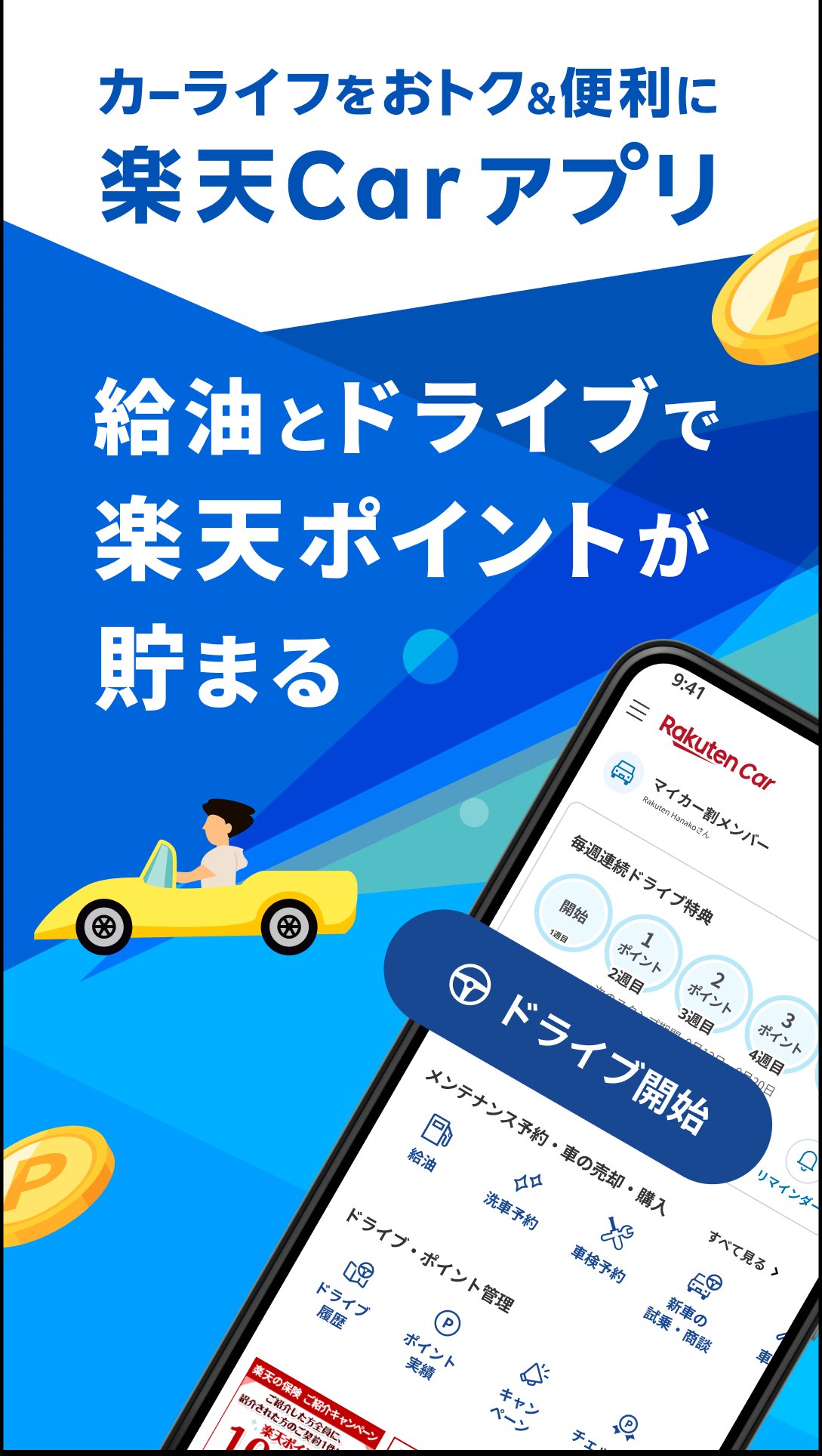 ・ドライブで毎月100ポイント以上GET!: 毎日のドライブで2km以上運転するだけで、楽天ポイントが貯まります。連続達成でボーナスポイントも!