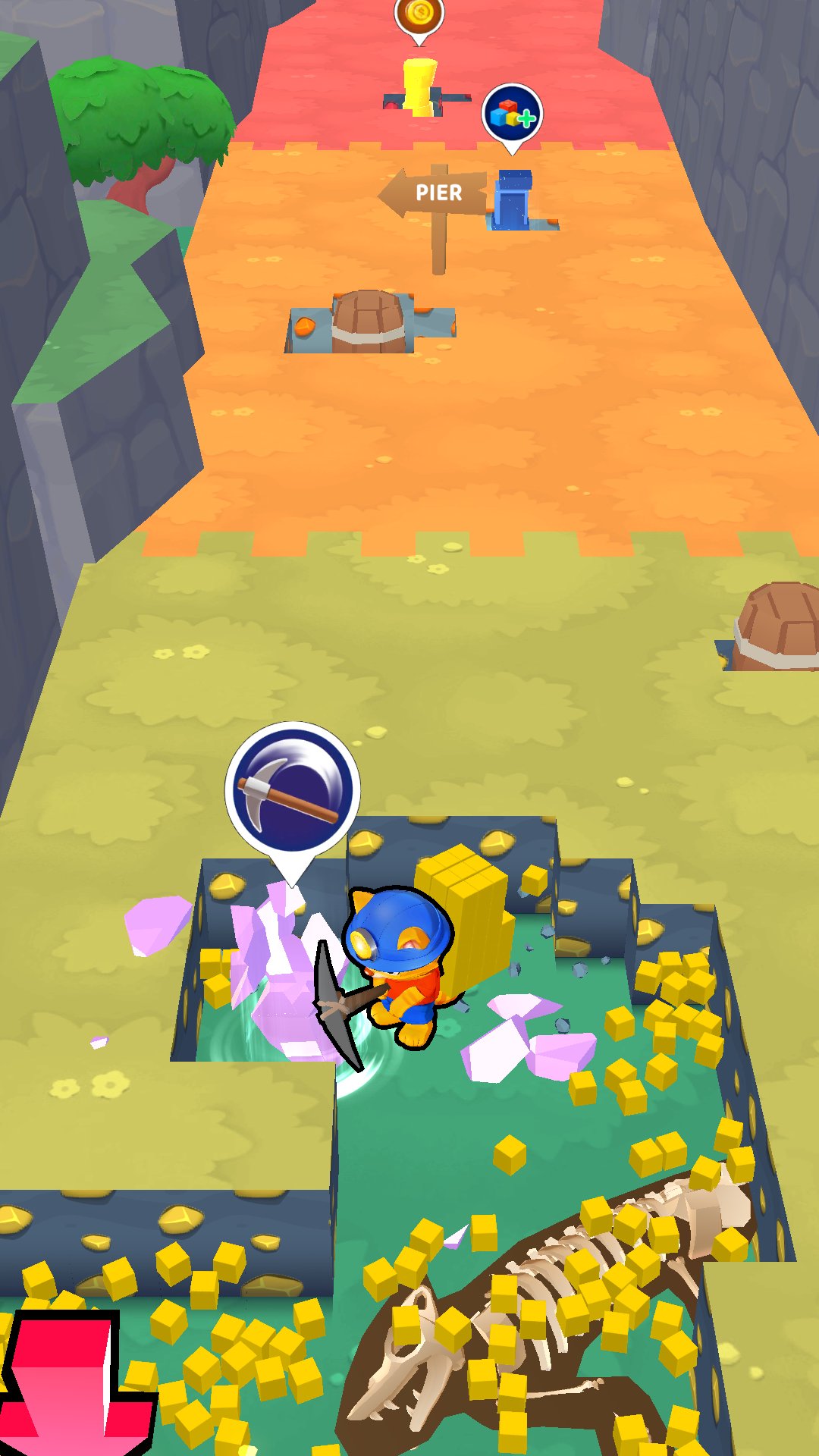 Use your gold to upgrade your base and your pickaxe to be stronger to... guess what? Explore even more!