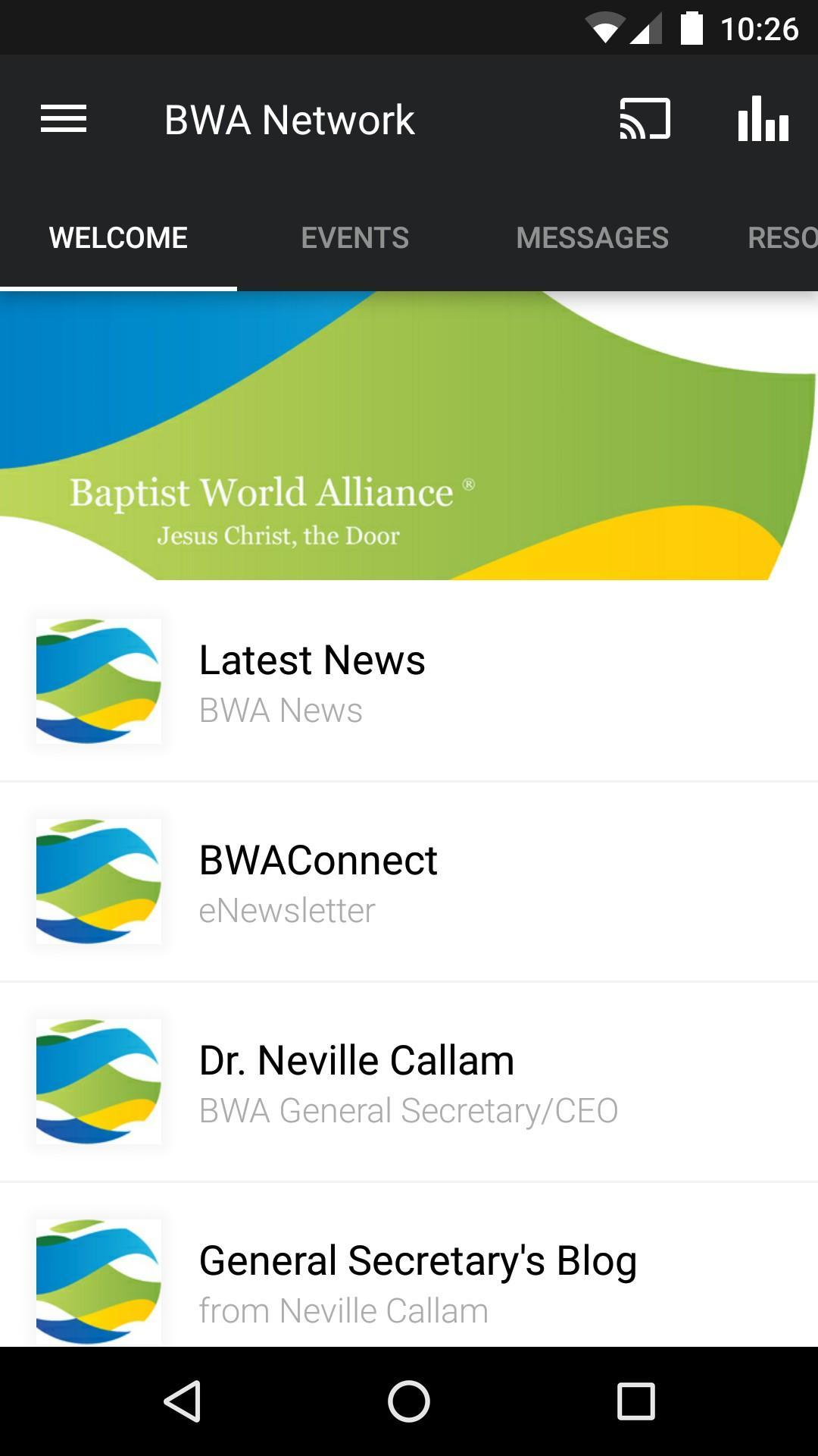 The Baptist World Alliance app was developed with the Subsplash App Platform.