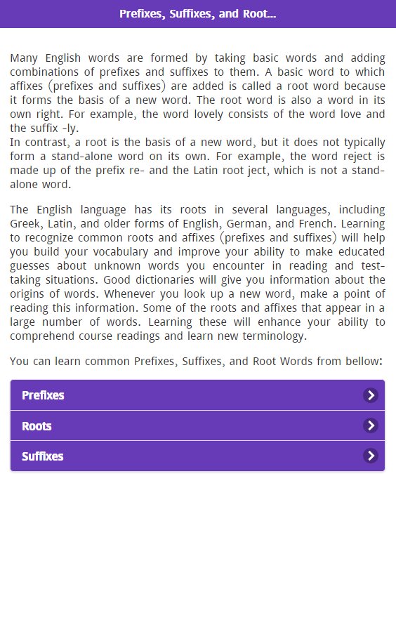 開発者Binary TutsからのPrefixes Suffixes & Root Wordは、過去にAndroidsystermで実行されています。