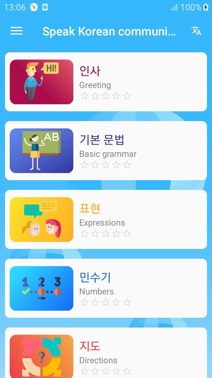 実用的なコミュニケーションの話題を通して、韓国のコミュニケをすぐに学びましょう。 「韓国語を話す」には、韓国語の発音と日常語に特に注意を払うレッスンが含まれています。旅行者や初心者向けに、2000を超える一般的な韓国語のフレーズや語彙があります。