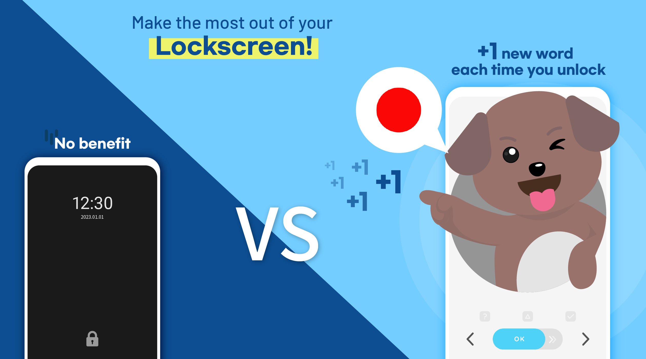 WordBitはロック画面に最適なサイズのコンテンツを提供するので、学習は瞬時に完了します。だから、いつもの学習を中断する必要はありません!
