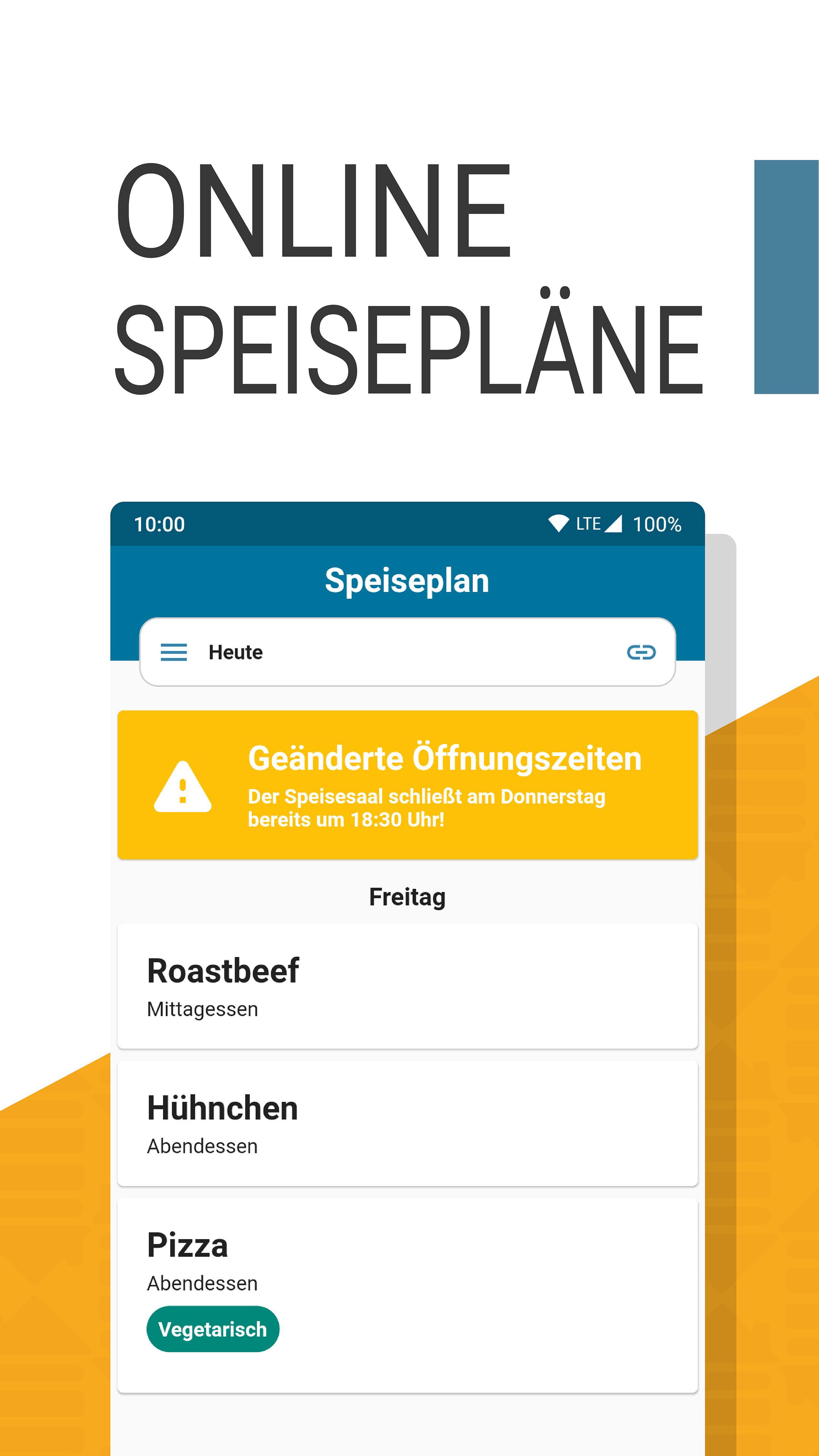 FoodTableアプリを使用すると、いつでも現在のメニューについて知ることができます。さらに、たとえば食事の時間の変更や重要なイベントの場合に、通知を受け取ります(もちろん、これらは非アクティブ化することもできます)。