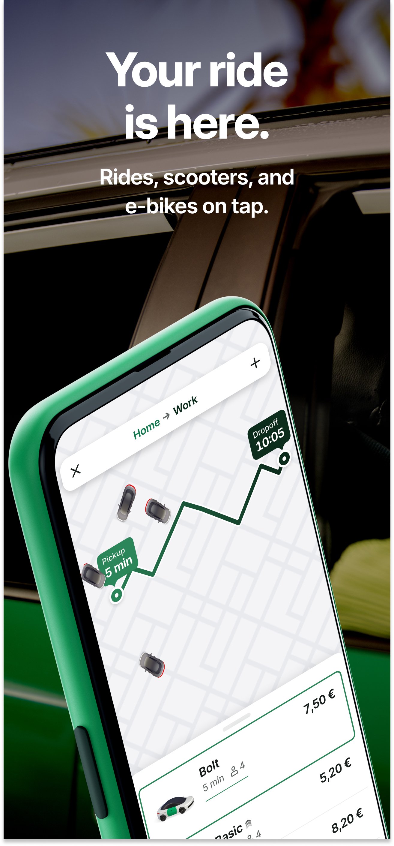 Boltでもっと楽に!街中を移動したい時、空港送迎をしたい時、渋滞を抜けてスクーターに乗りたい時など、Boltアプリを使えば、安全で便利に移動できます。