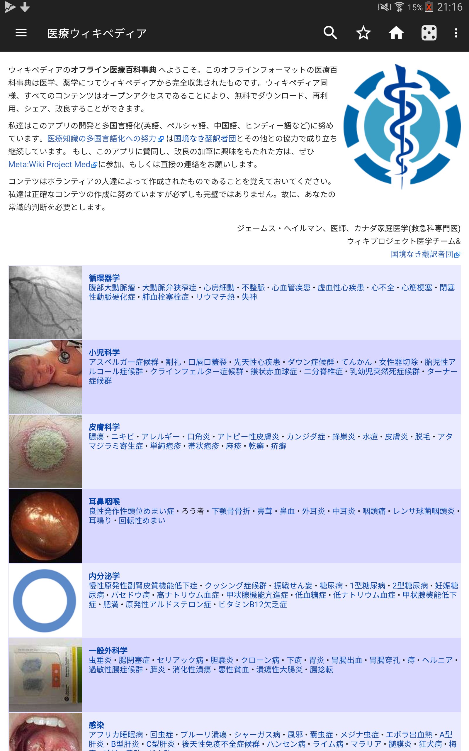 ウィキペディアのオフライン医療百科事典は、医療記事がまとめられたアンドロイド最大の医療百科事典です。この百科事典には、医学、解剖学、薬物療法、衛生についての記事が含まれています。インターネットのない発展途上地域やインターネットの繋がらない船上環境などでも、このオフライン百科事典なら最新の医療辞書に無料でアクセスできます。医師や医学生などの医療に関わる人や単に興味のある人にも最適です。また、いくつかの言語選択があり、その範囲を拡大する努力を継続しています。