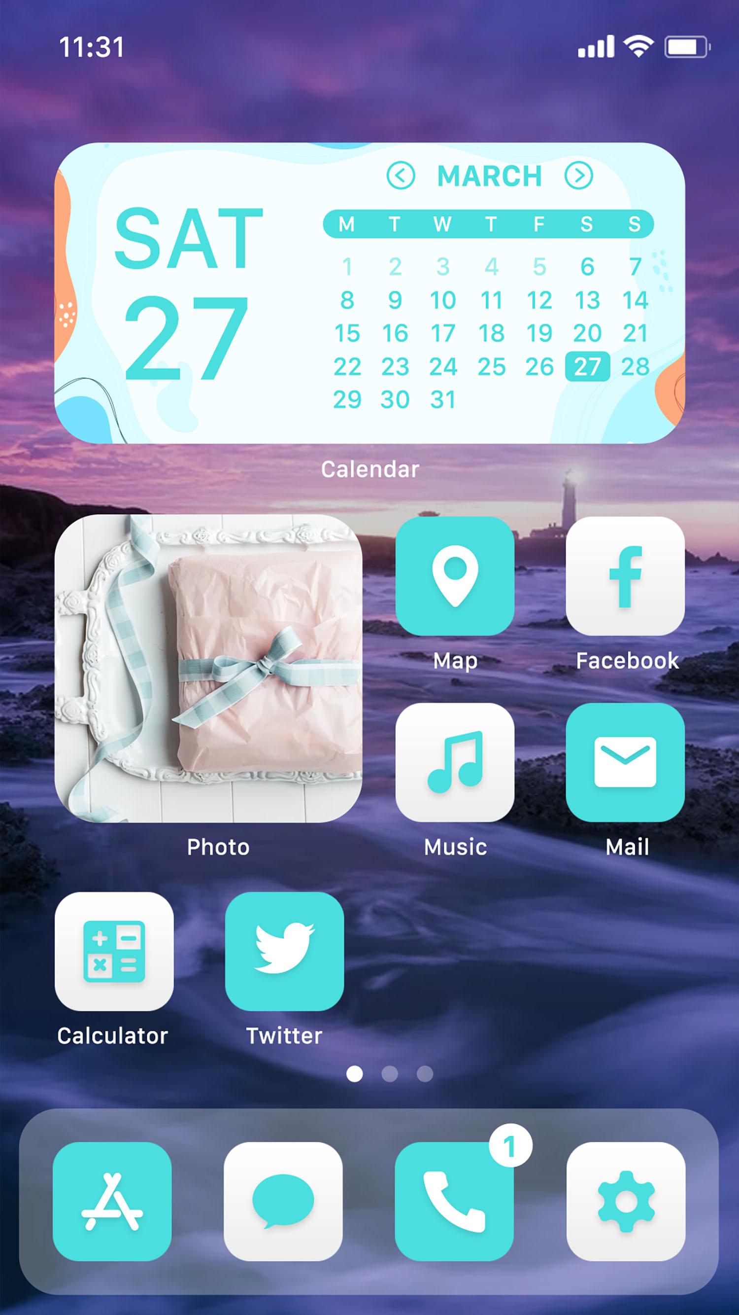 - 3 つのウィジェットをサポート: ターコイズ ホワイトのテーマ スタイルでデザインされたカレンダー、写真、時計など