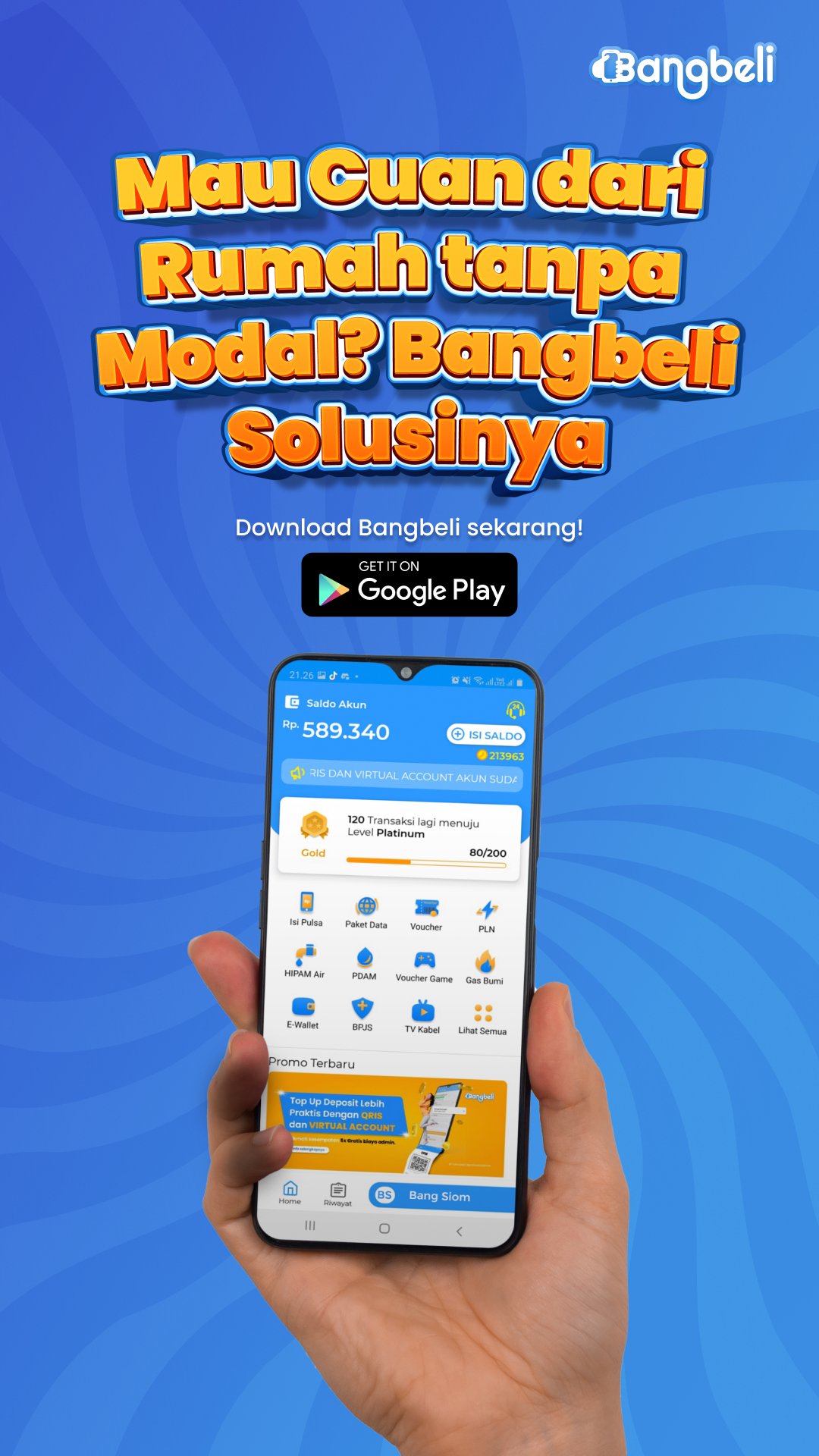 Bangbeli は、何千ものデジタル製品を備えた、最も安価で最も完全なデジタル決済ビジネス パートナー アプリケーションです。アプリケーションをダウンロードするだけで、何百万ルピアも複雑な資本なしで獲得できます!