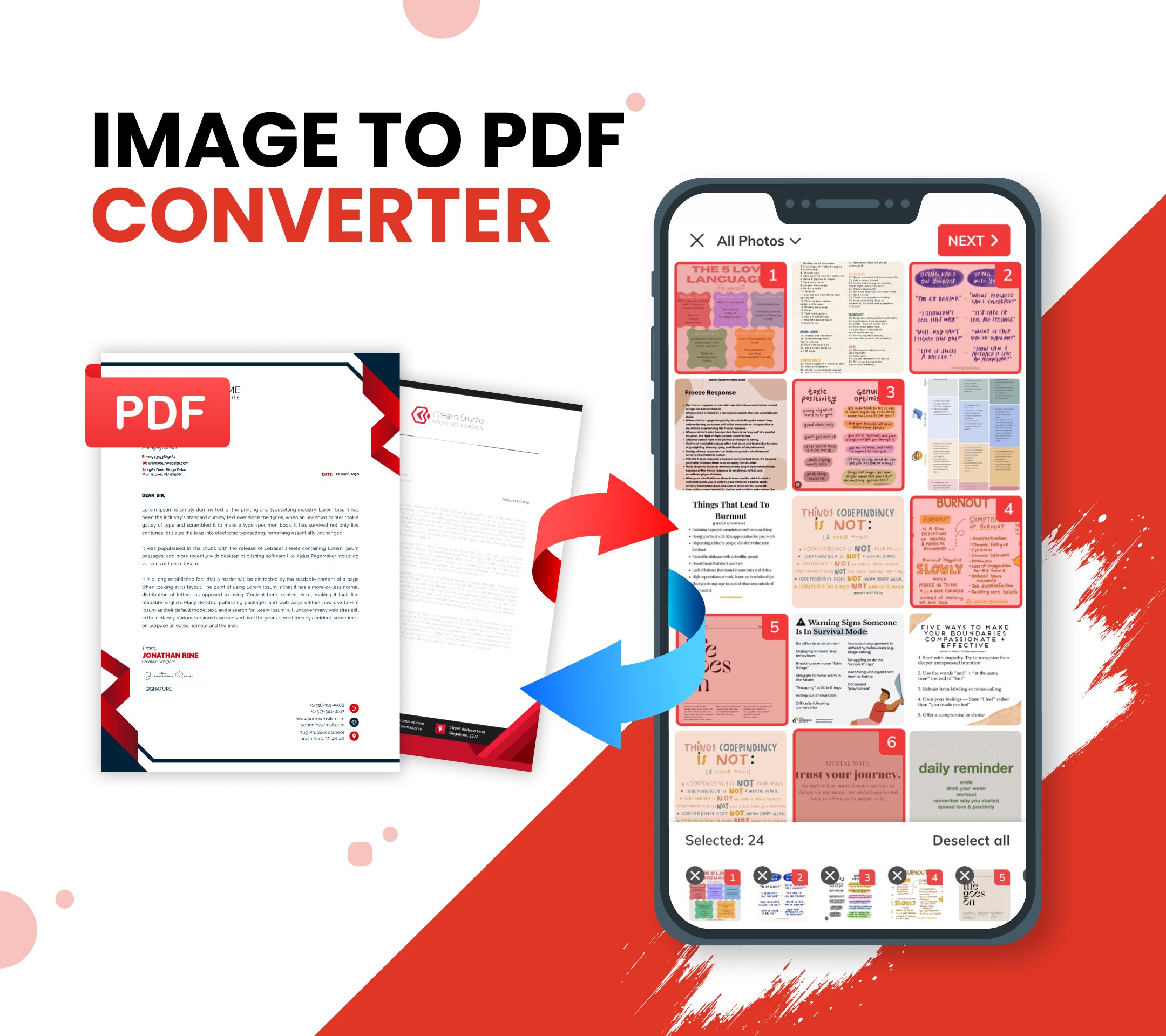 JPEG変換 ファイルに、または PDF を PDF変換 に変換するのに役立つ最も便利なアプリの 1 つである 写真 PDF 変換 を紹介します。 ギャラリーから写真をアップロードするだけで、JPG 変換 することで写真が圧縮され、PDF ファイルにエクスポートされます。 さらに、PDF を画像に変換し、PDF ファイルを専門的に管理することもできます。