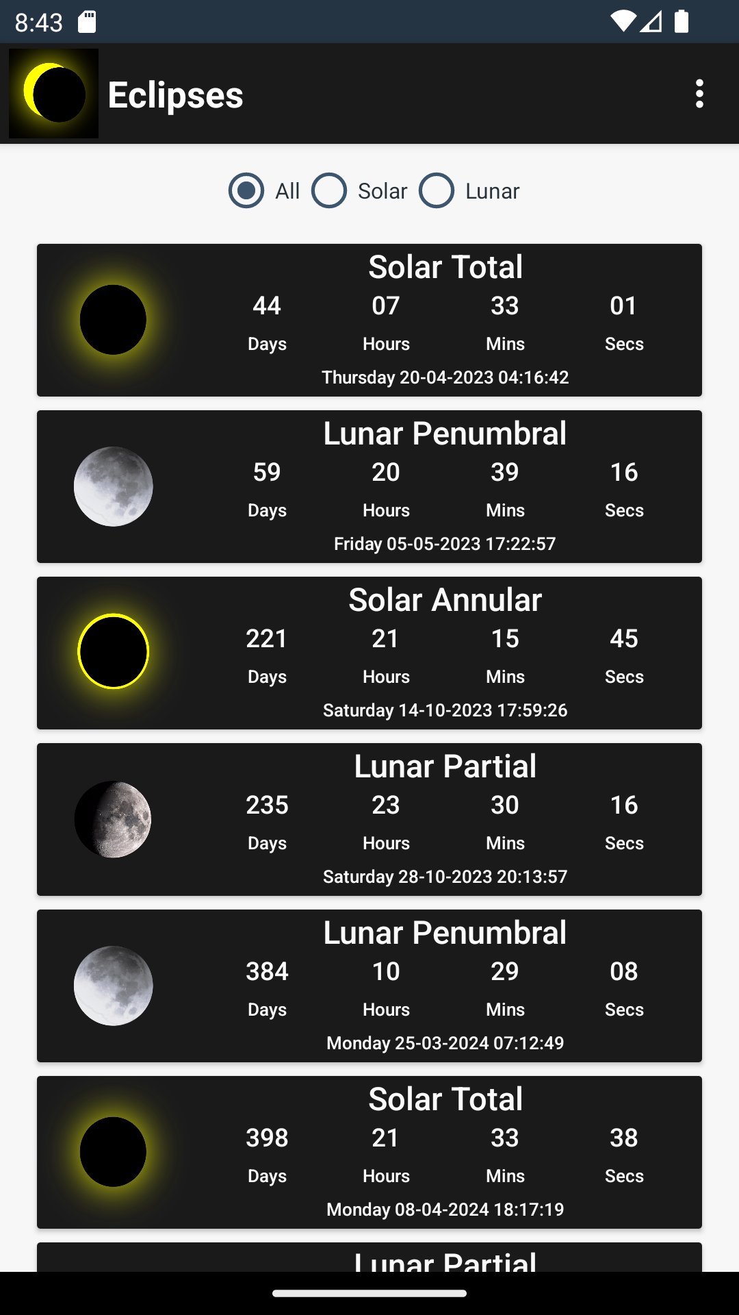 今後の日食と月食を予測するためのアプリケーション。秒までのリアルタイムのカウントダウンを提供します。月食 (部分、皆既、または半影) まで、日食 (皆既、金環、および部分) を処理できます。
