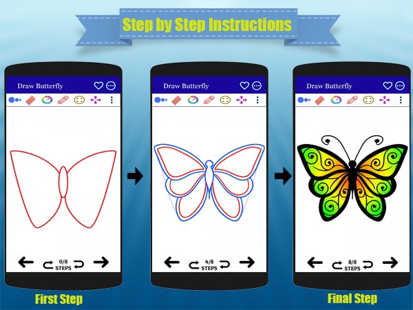 The how to draw a butterfly app is a simple and easy to use. We will help you learn how draw a butterfly by using an outstanding step-by-step instructions and comprehensive tutorial to draw butterfly. Do you want to surprise your friends with a beautiful butterfly drawing or just want learn how to draw butterfly? Then this free animal drawing game is the best for you.