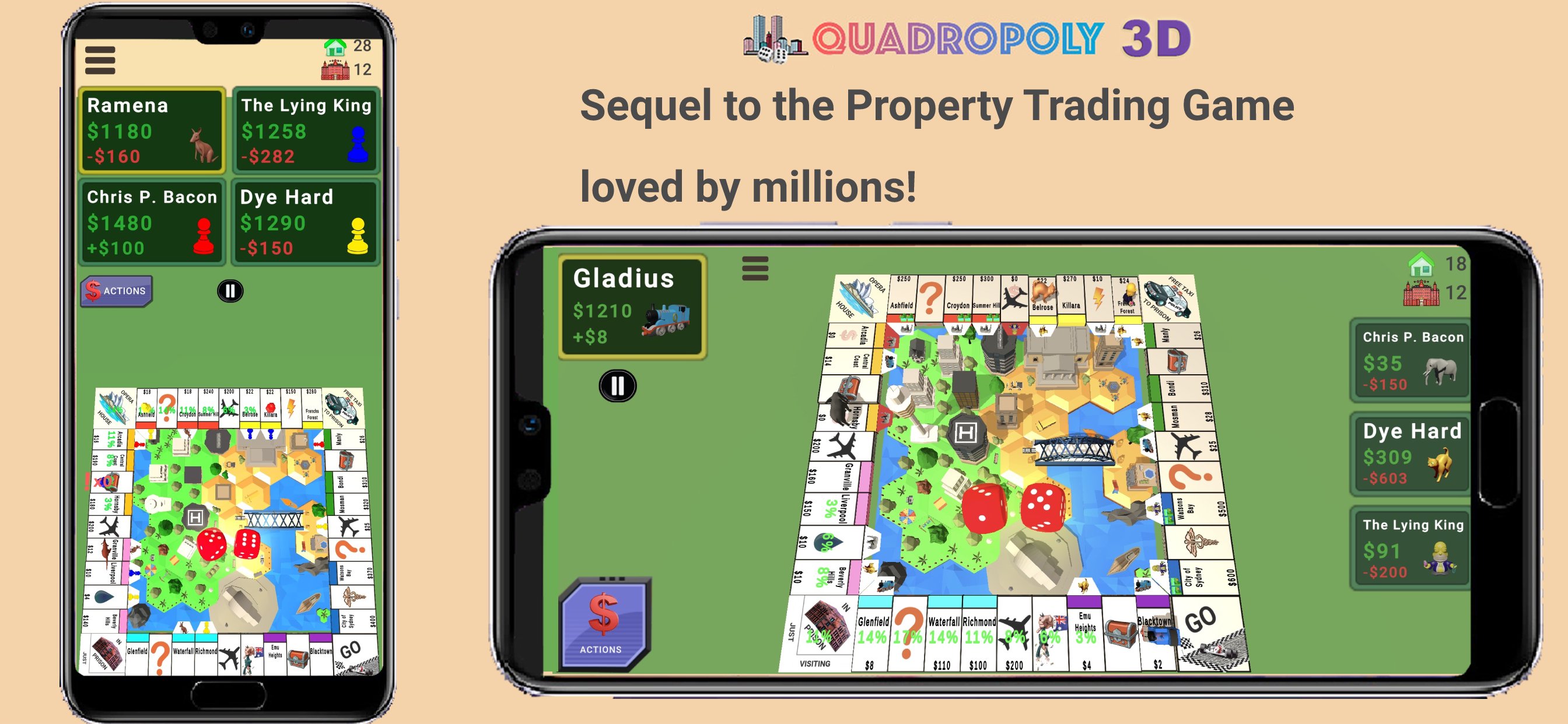 Welcome to Quadropoly 3D, the unique and improved variant of the Classic Quadropoly - a property card trading board game that has captured the hearts and mind of millions of families across the World. Quadropoly offers a unique twist on the classic business board game: an ability to hone your financial management and negotiation skills and learn business strategies from the most patient and experienced teacher of all – an Artificial Intelligence. AI has been trained with Machine Learning models on all games played by millions of players since 2016. This innovative technology ensures that the game is challenging and engaging for players of all skill levels.