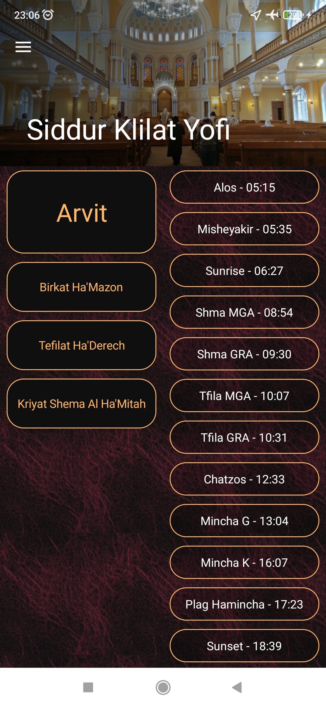 In addition - the app displays the prayers that are relevant to the time of the day on the main screen and matches them to the date, so that on the first of the month it will also presented Halel and Musaff, and will remind you to say Yale ve'Yavo, etc.
