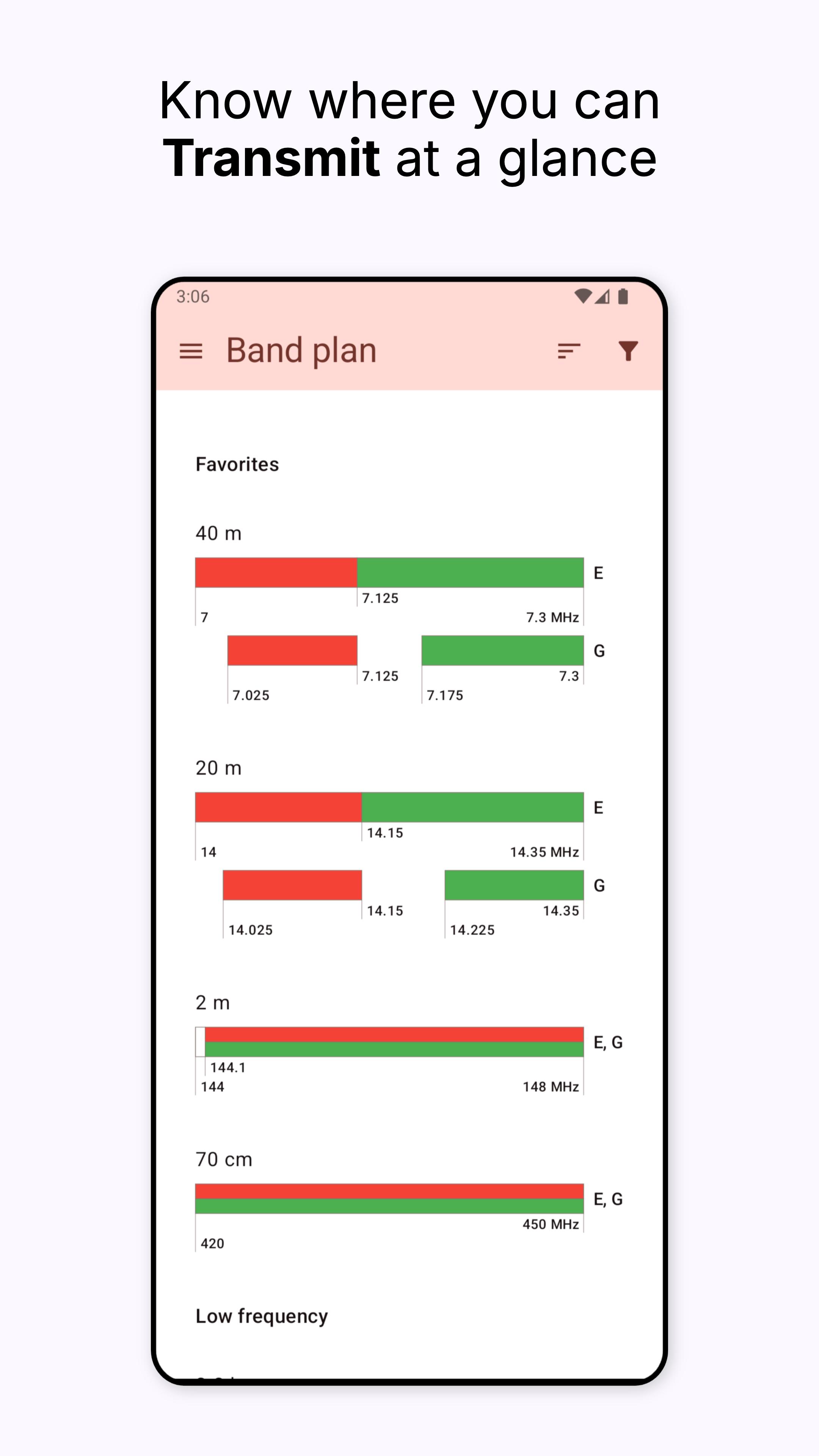 • Graphical band charts – Visual layouts of each amateur radio band make it easy to find your segment and understand frequency allocations
