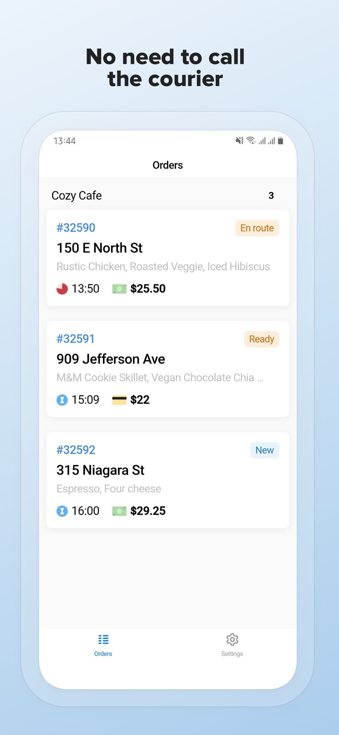 The courier receives notifications about new orders and the readiness of dishes from the cashier and the cook. This helps the staff to work smoothly without additional phone calls.