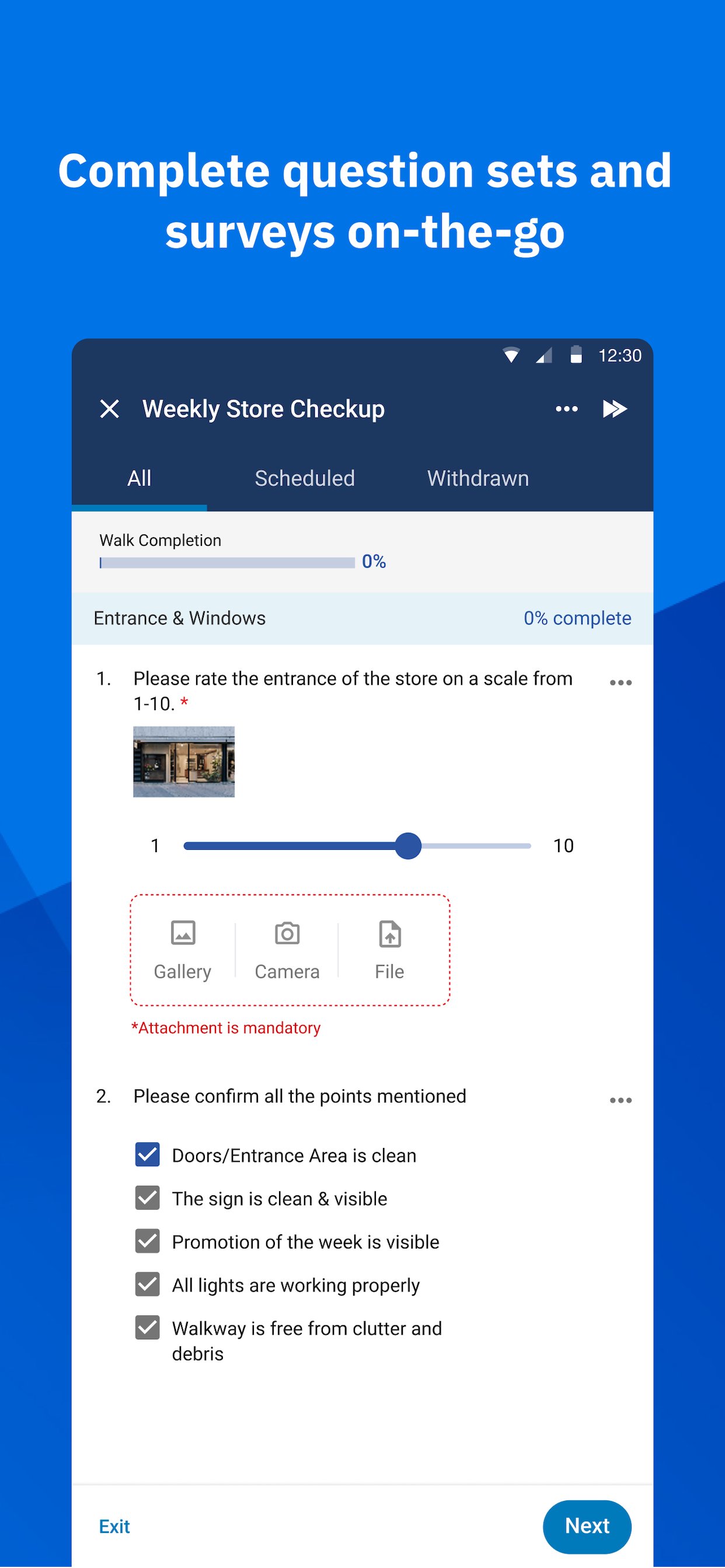 Zebra Workcloud Walk streamlines and automates on-site inspection processes. Create standardized question sets and surveys for all the topics and functions that make a difference at locations—from cleanliness, merchandising sets, loss prevention, and more. With mobile-first on-site audits, field managers can more consistently identify non-compliance, while corporate stakeholders have real-time visibility into inspection results and corrective actions.Zebra Workcloud Walk streamlines and automates on-site inspection processes. Create standardized question sets and surveys for all the topics and functions that make a difference at locations—from cleanliness, merchandising sets, loss prevention, and more. With mobile-first on-site audits, field managers can more consistently identify non-compliance, while corporate stakeholders have real-time visibility into inspection results and corrective actions.