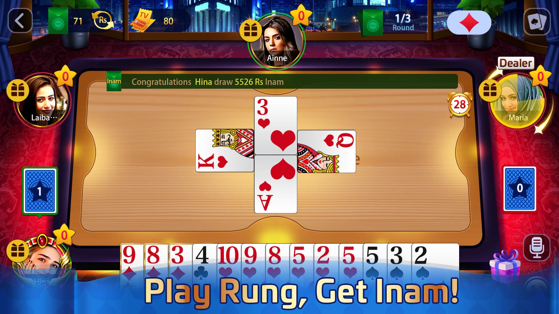 Come and join this E-Sports league competition of Rung/Rong/Court Piece/HOKM free online game, win the rewards and present yourself on TV!