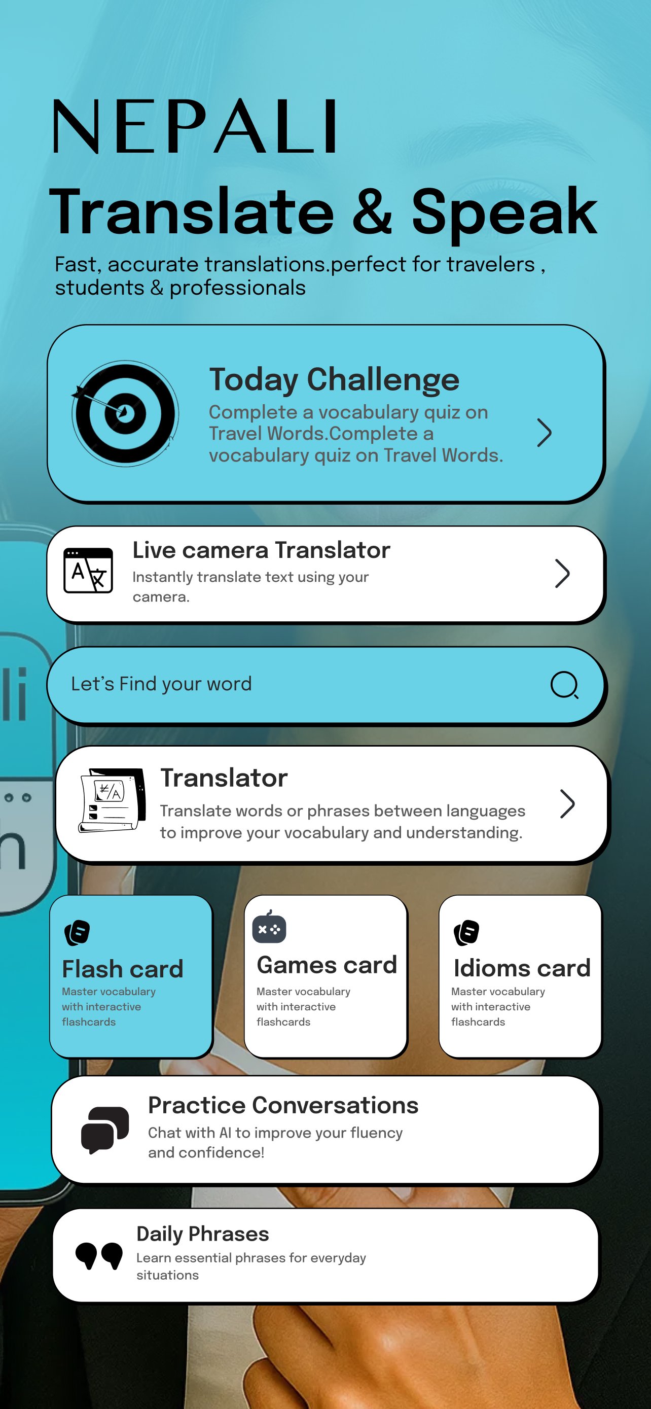 This English to Nepali Translator app offers instant translations, a built-in Nepali Keyboard and Translator, voice and camera translation, and a rich Nepali to English Dictionary with pronunciation and usage examples.