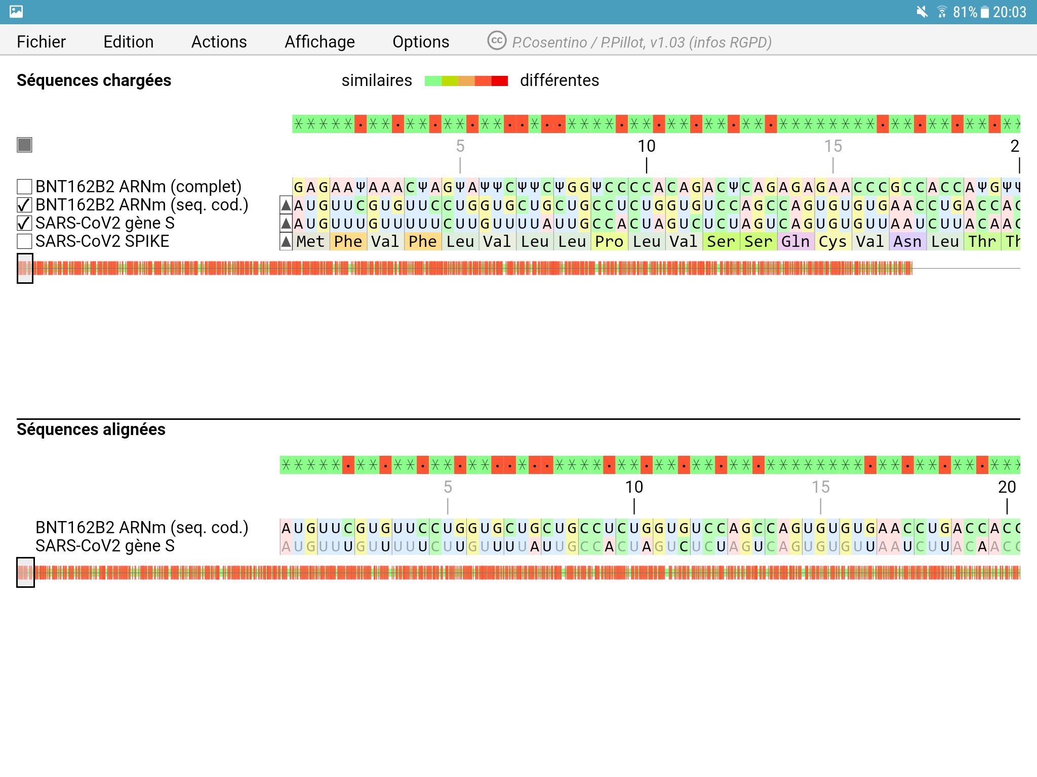 Geniegen2 is an application primarily intended for French-speaking high school students. With this application it is possible to align and then compare nucleotide or polypeptide sequences, but also to process them (transcription, translation etc.).