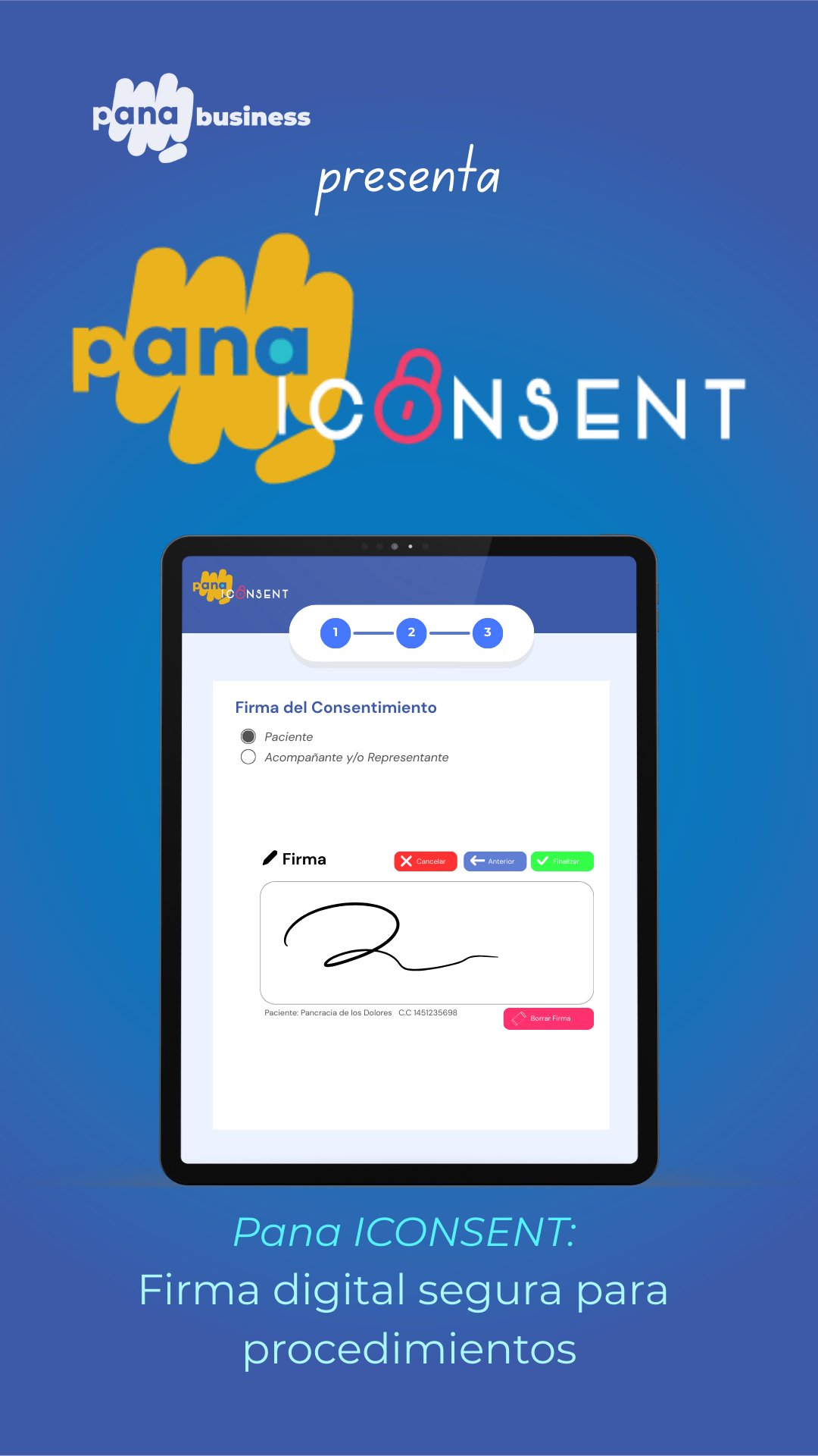 Pana ICONSENT is the ideal app for signing digital informed consent for your members and their medical procedures. With it, you will be able to have total control of the information and the peace of mind of having good protocols in medical procedures with the help of good technology. Learn more benefits:
