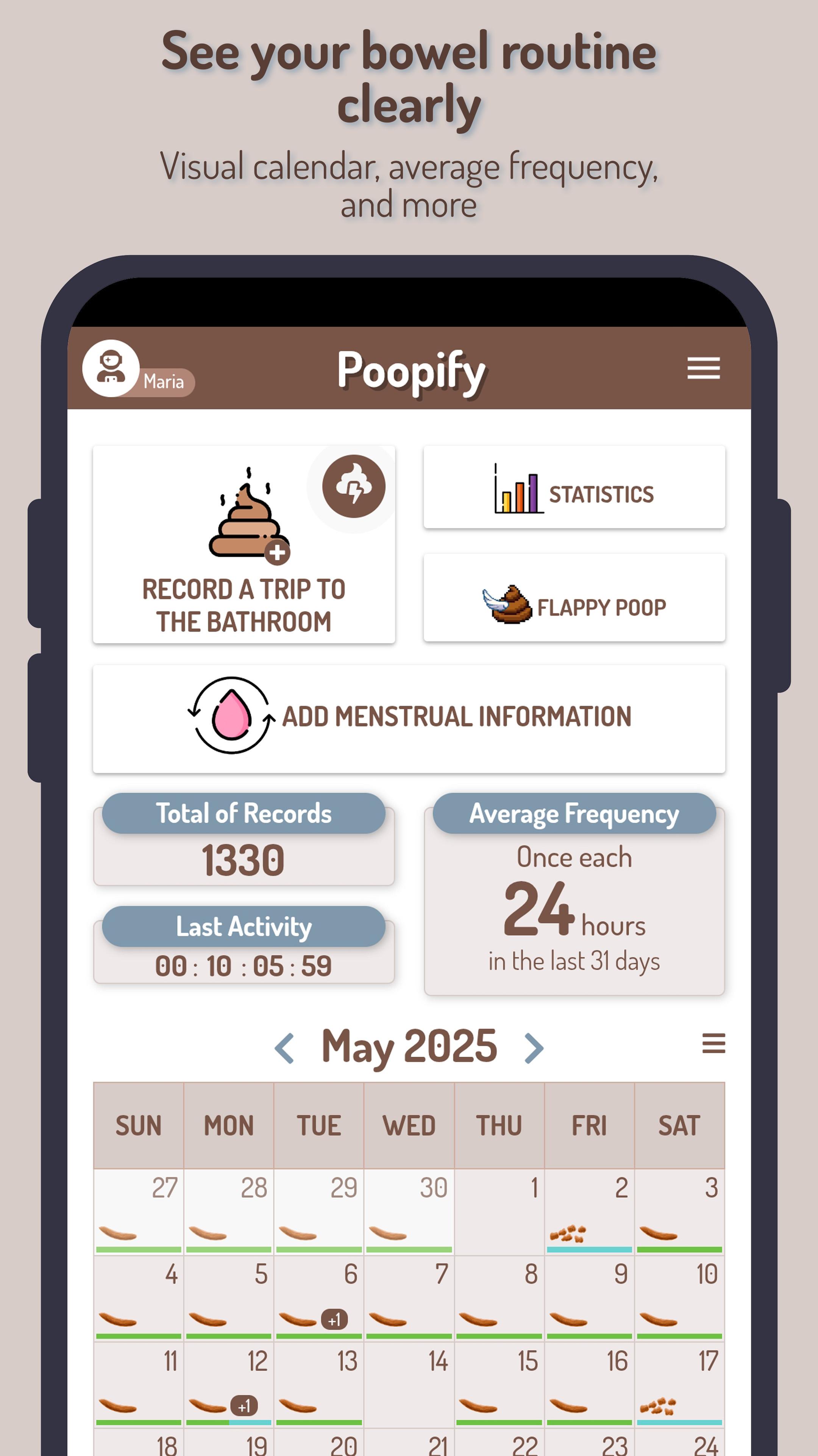 Poopify offers insightful statistics and charts about your bowel habits, frequency, timing, and patterns. These tools help you understand your digestive routine and provide valuable data to share with your doctor, especially if you're managing a health condition.