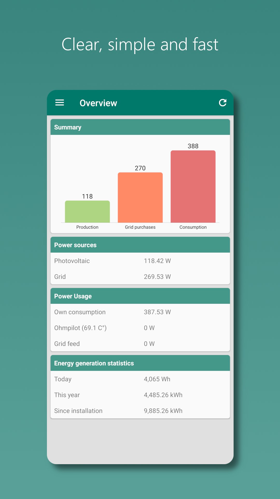- Real time data about your energy use (Own consumption, Grid feed, Battery charge and Ohmpilot)