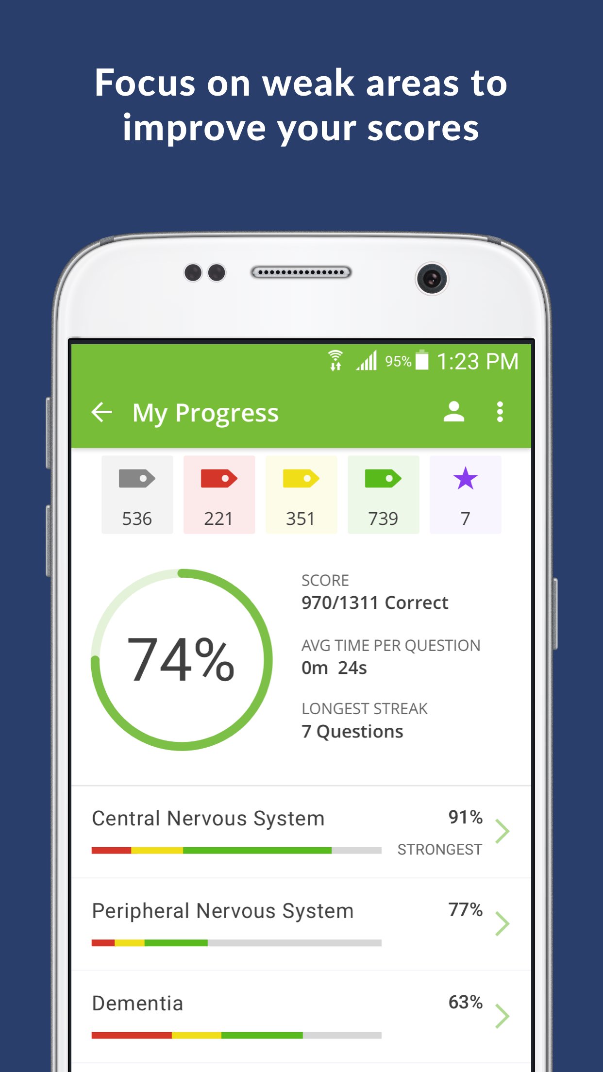 • Detailed results tracking that shows your strongest and weakest areas