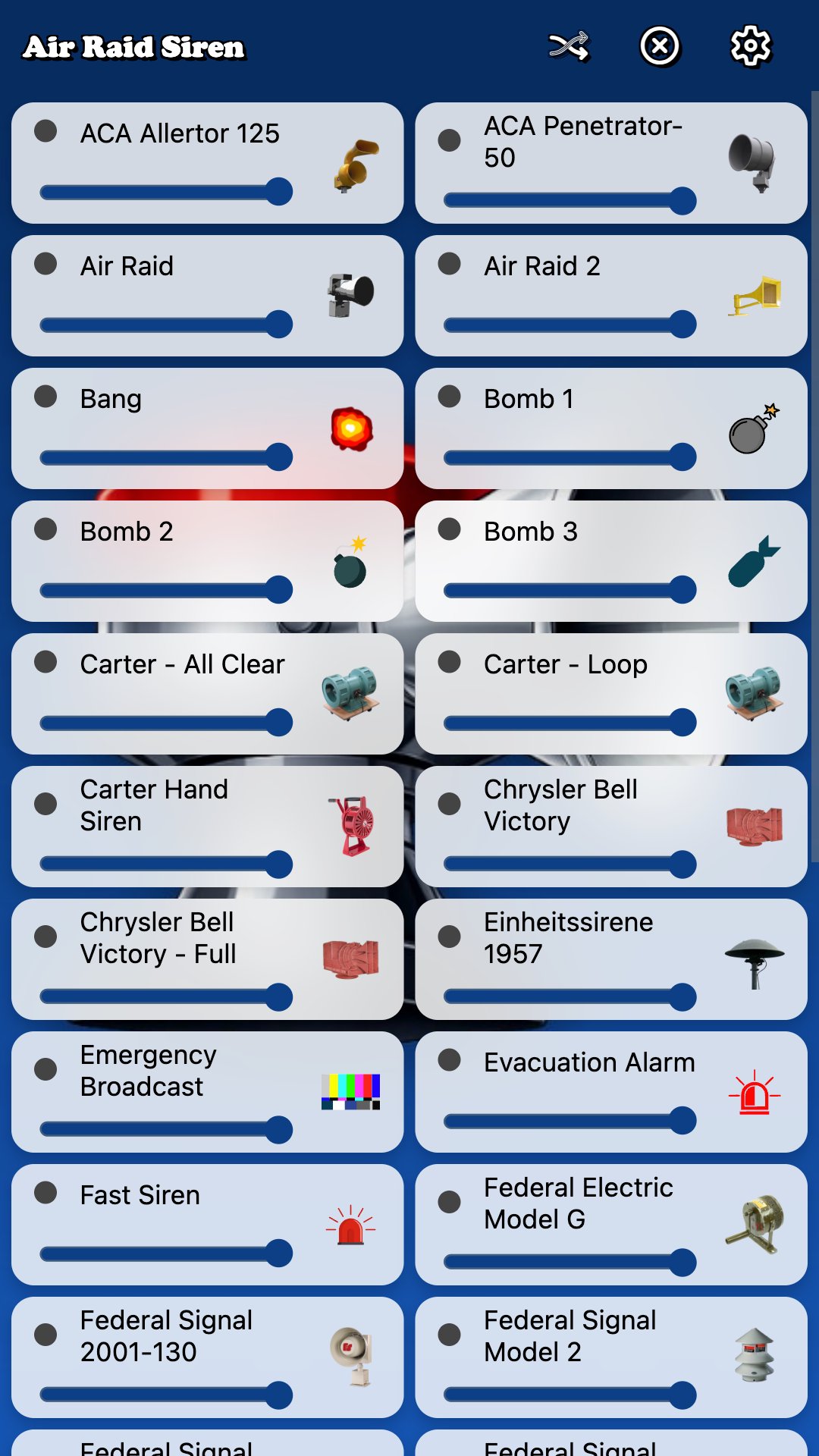 Air Raid Siren is a soundboard app featuring clips of your favorite air raid and tornado warning sirens. All of the classic and popular sirens are here, from many different countries. Tap on a sound to play or long press for more options. You can find additional customization settings in the app menu.